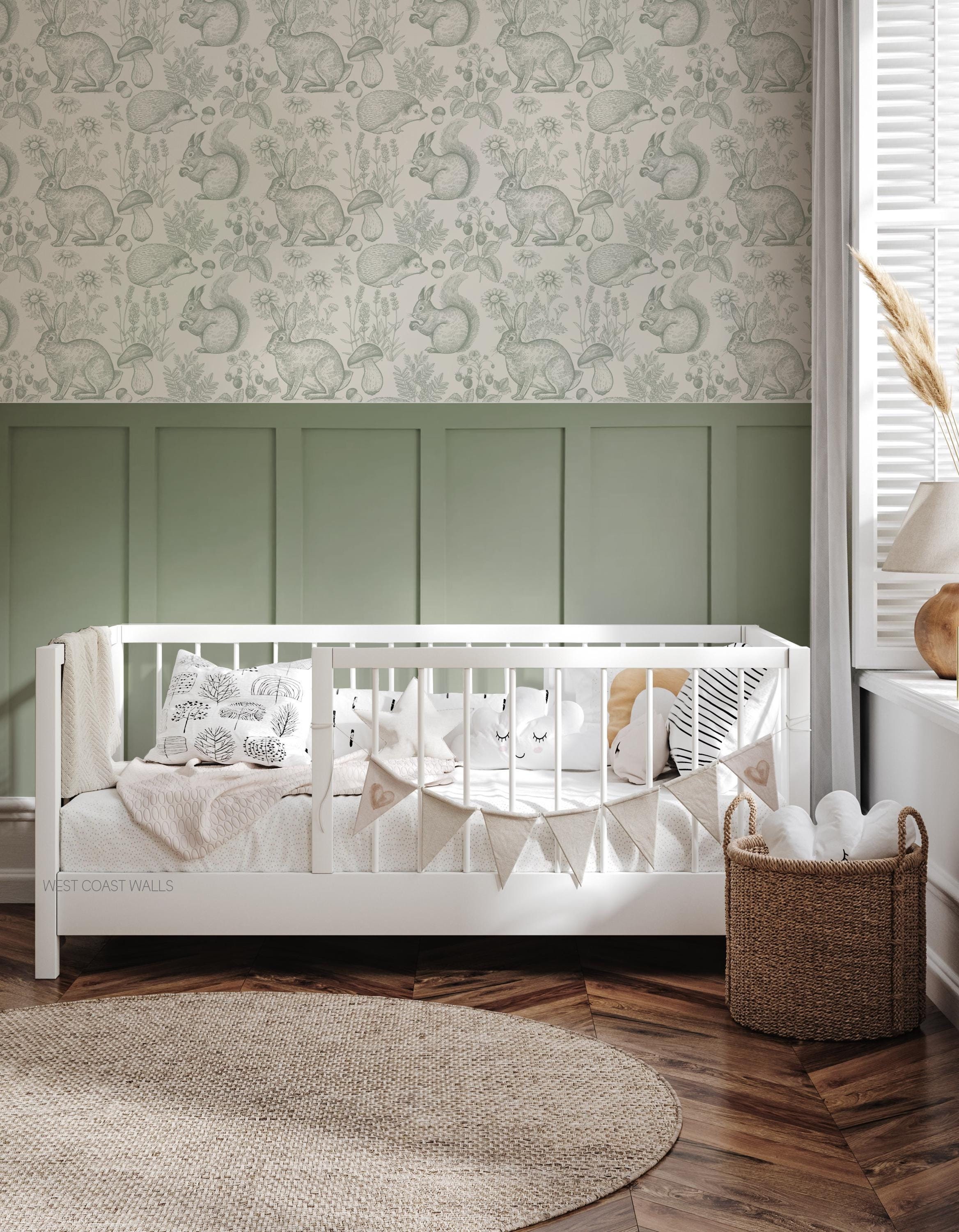 "Be immersed in a whimsical oasis with this high quality, hand sketched woodland animal wallpap...