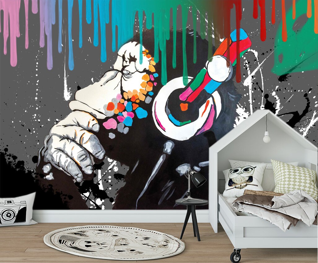 "Graffiti monkey with headphones wallpaper Music mural Gorilla art gift Colorful Abstract print...