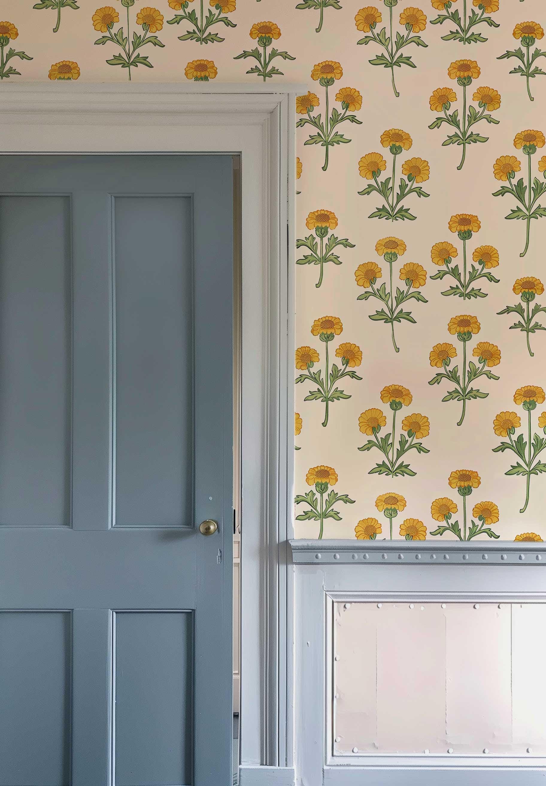 "Add a sunny splash of happiness to your space with our minimalistic marigold flower wallpaper!...