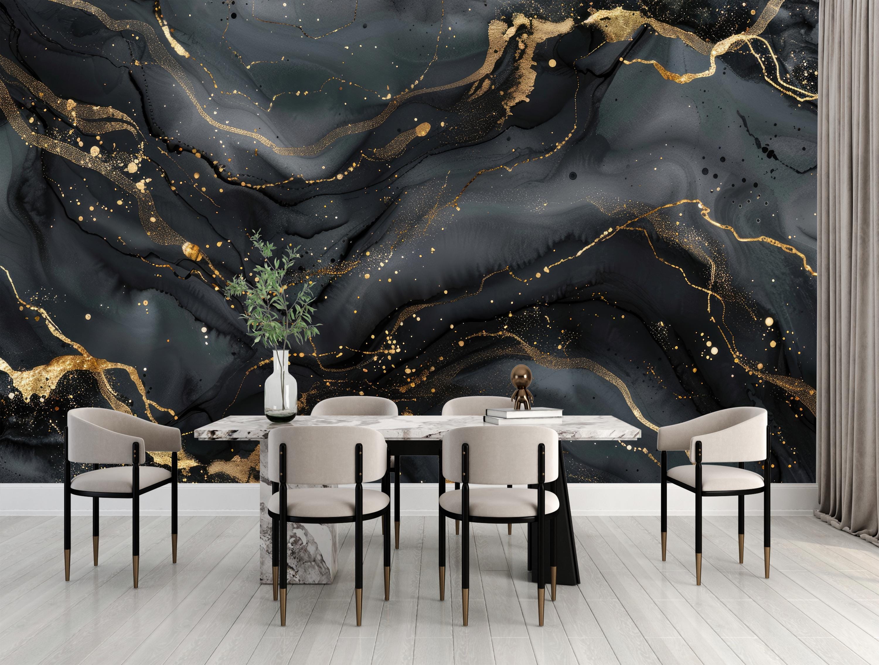Black Gold Marble Wallpaper Peel and Stick,Gray Ink Mural,Luxury Wa...