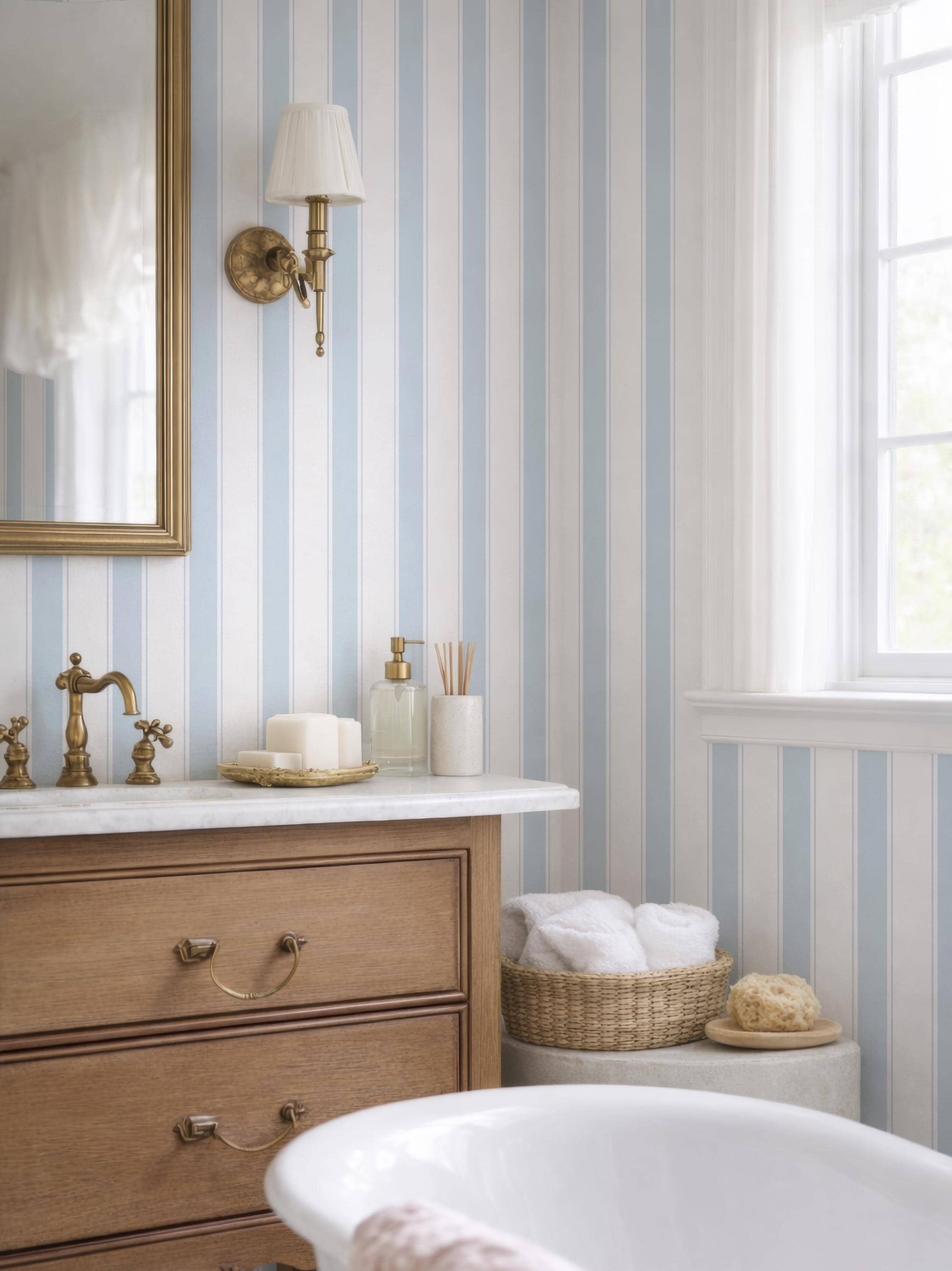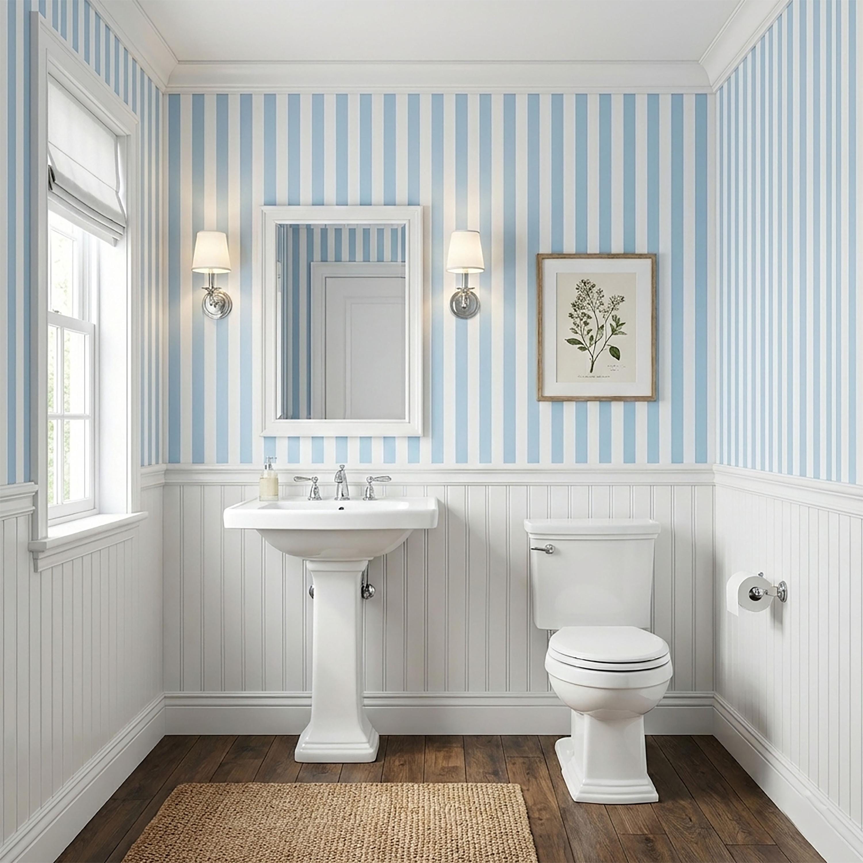 "Soft coastal blue stripes with a calm, airy feel. Peel and stick design installs easily and su...