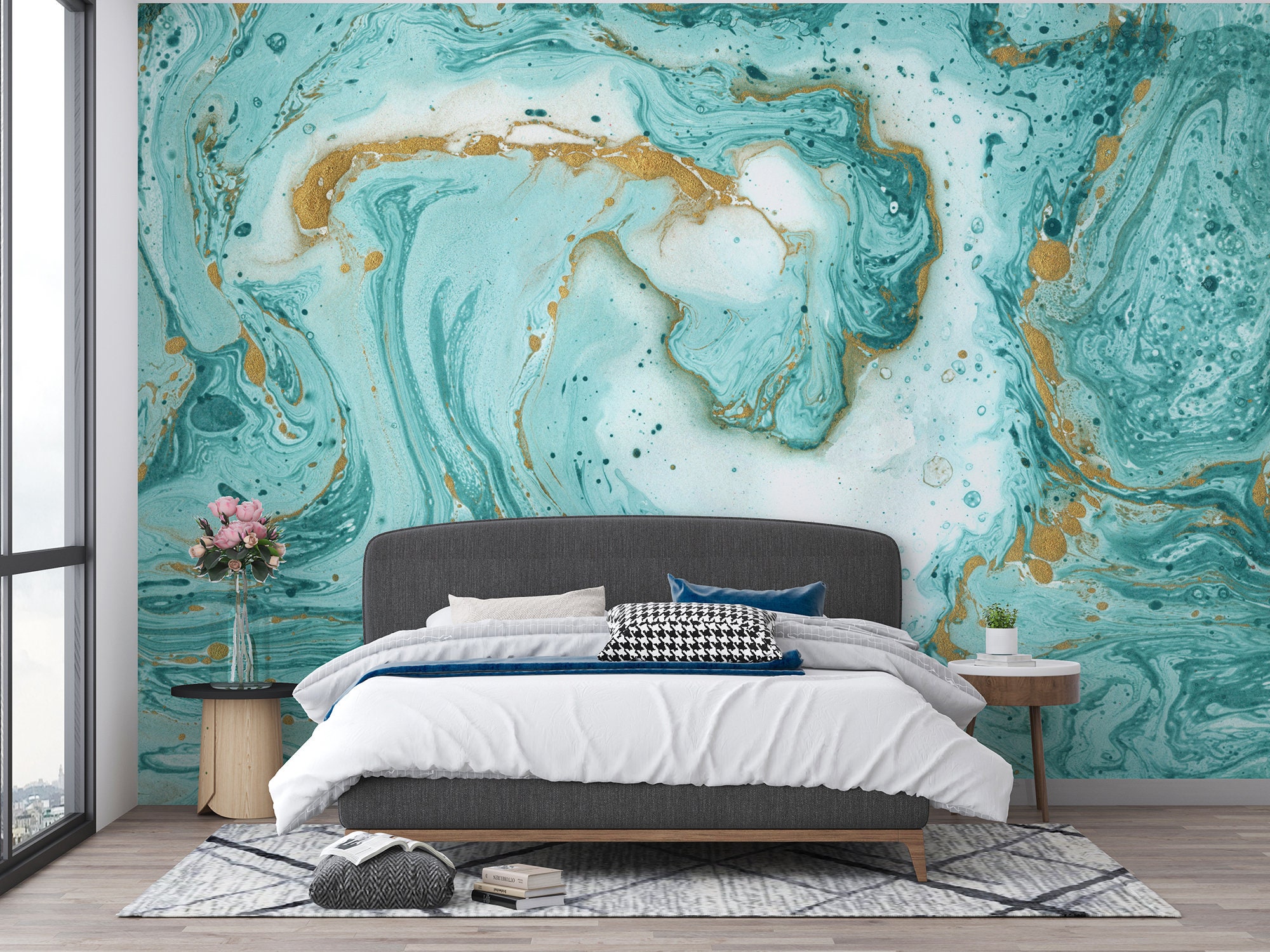Turquoise Gold Marble Peel & Stick Wallpaper, Marble Wall Mural...