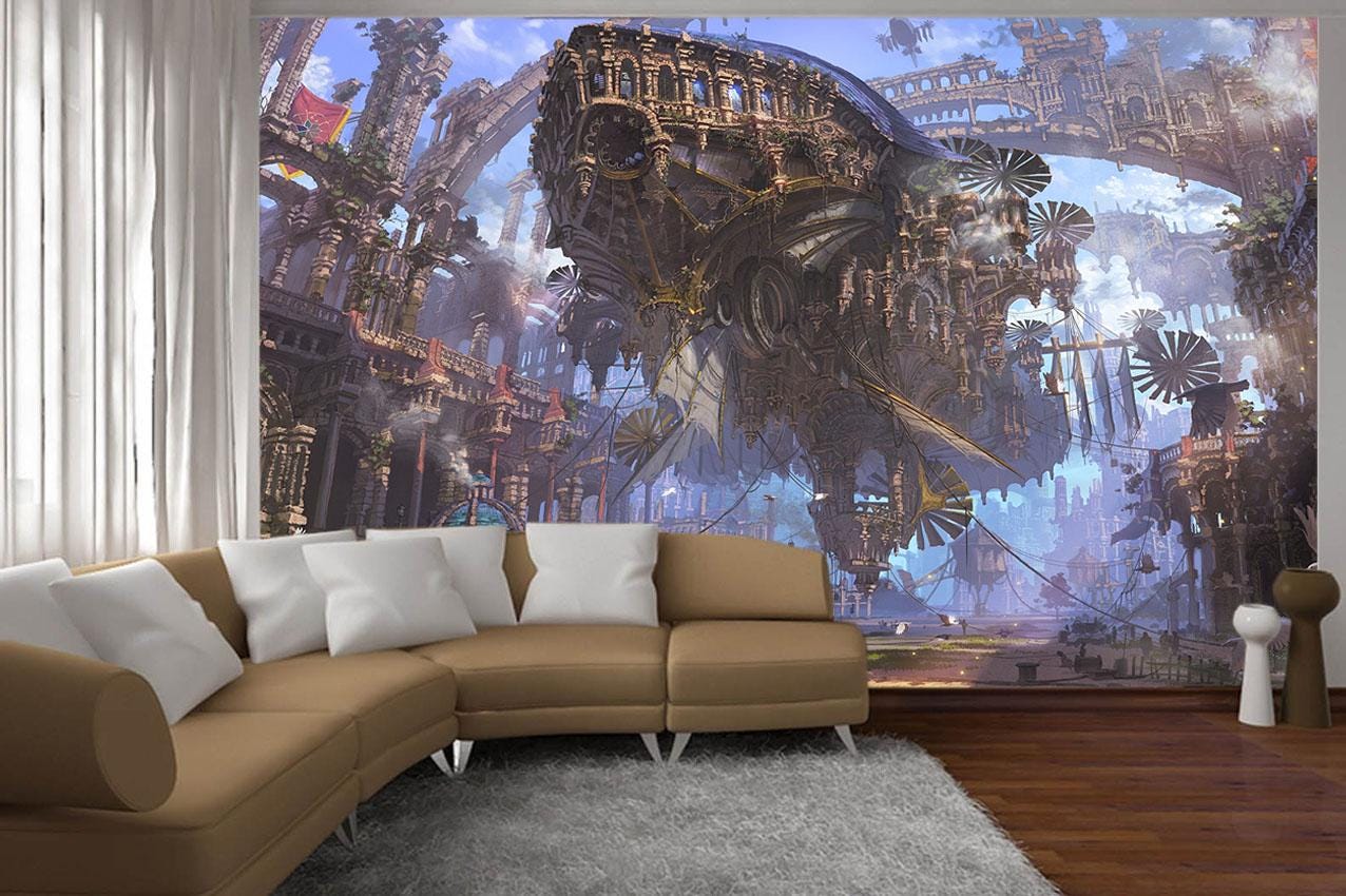 "Epic fantasy wall mural with a floating steampunk city and futuristic architecture. This large...