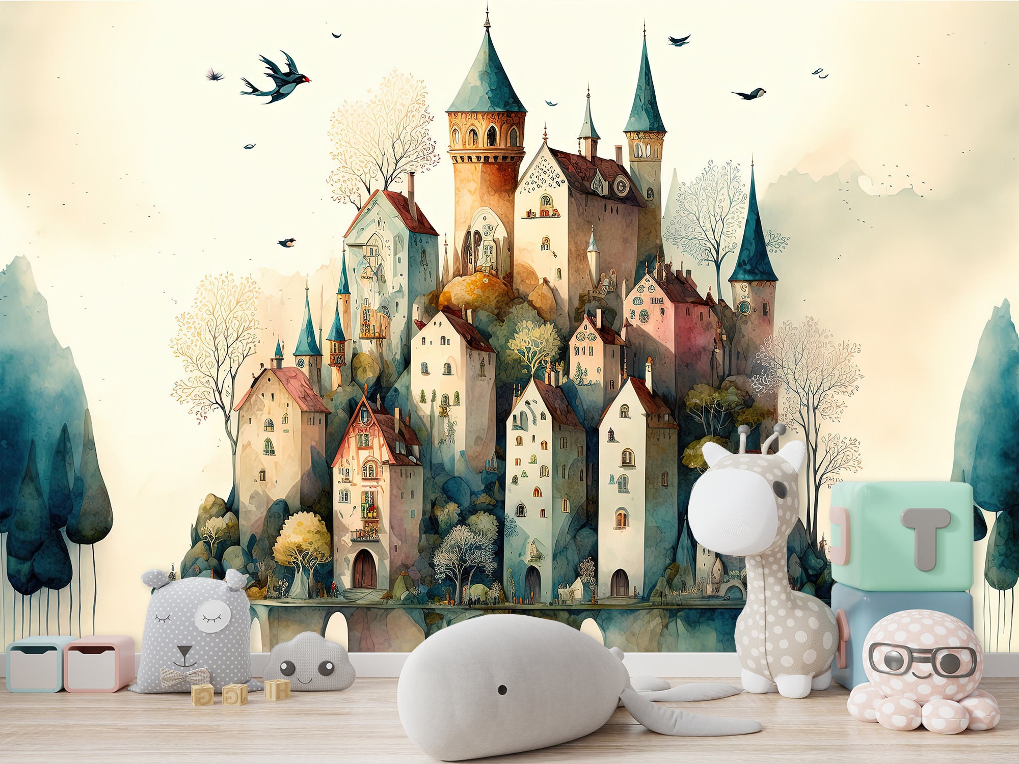 "Fairy Tale City Castle Watercolor on the wallpaper is perfect for decorating a bedroom, living...