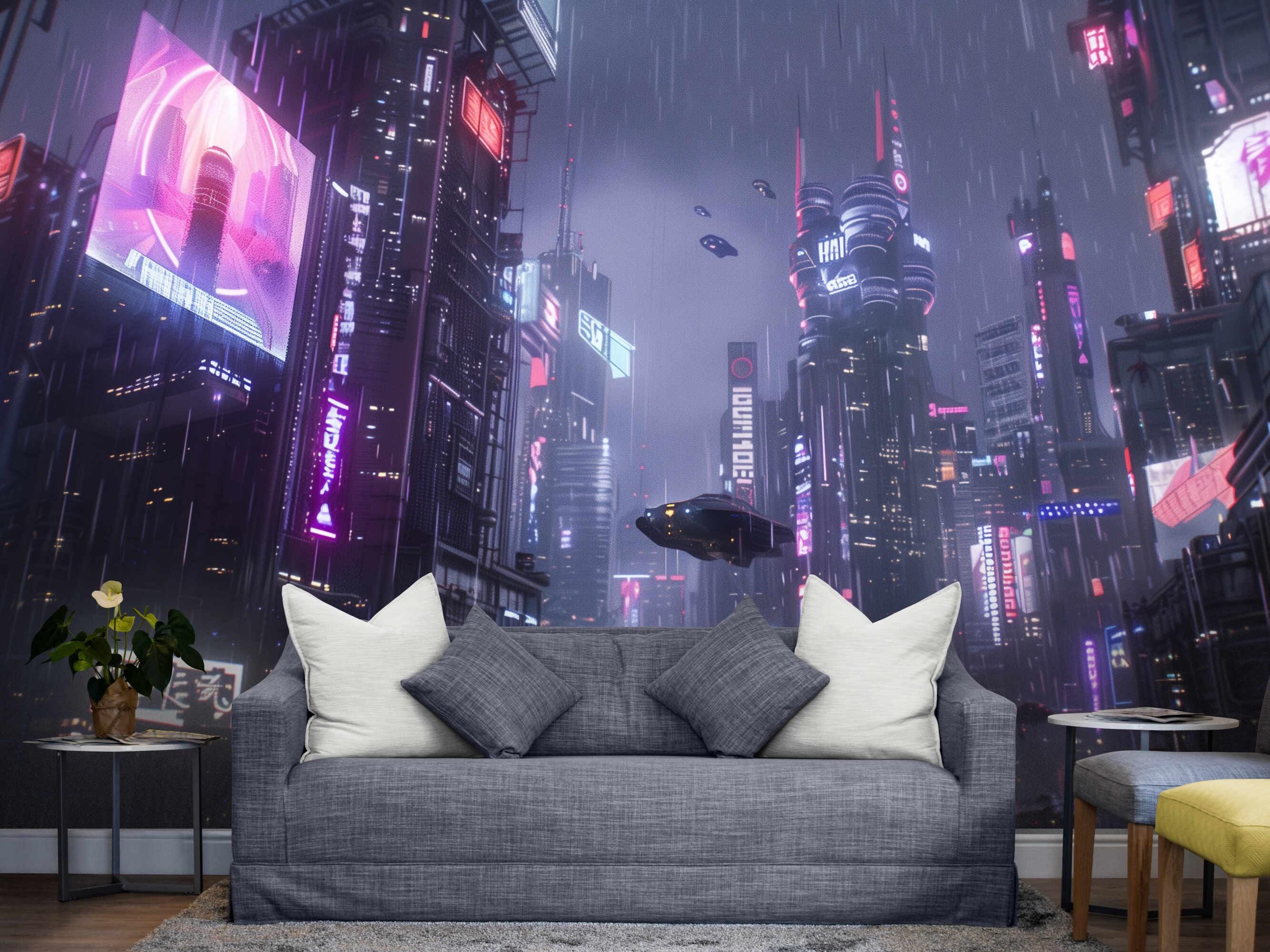 Cyberpunk Futuristic City Wallpaper Mural - Sci-Fi Night Skyline Wa...