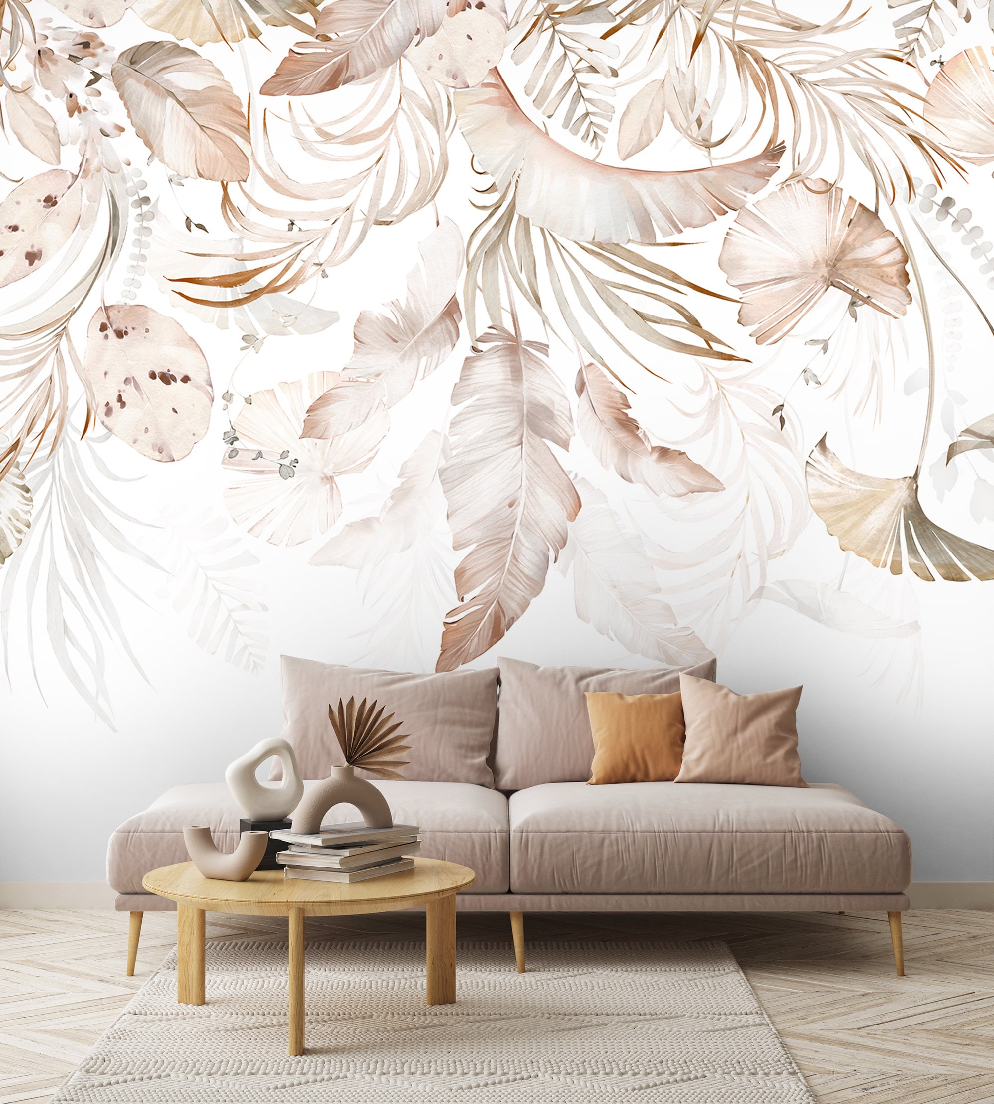 Watercolor Boho Plant Wallpaper Peel and Stick | Monochrome Bohemian Banana Leaf Wall Mural | Scandi...