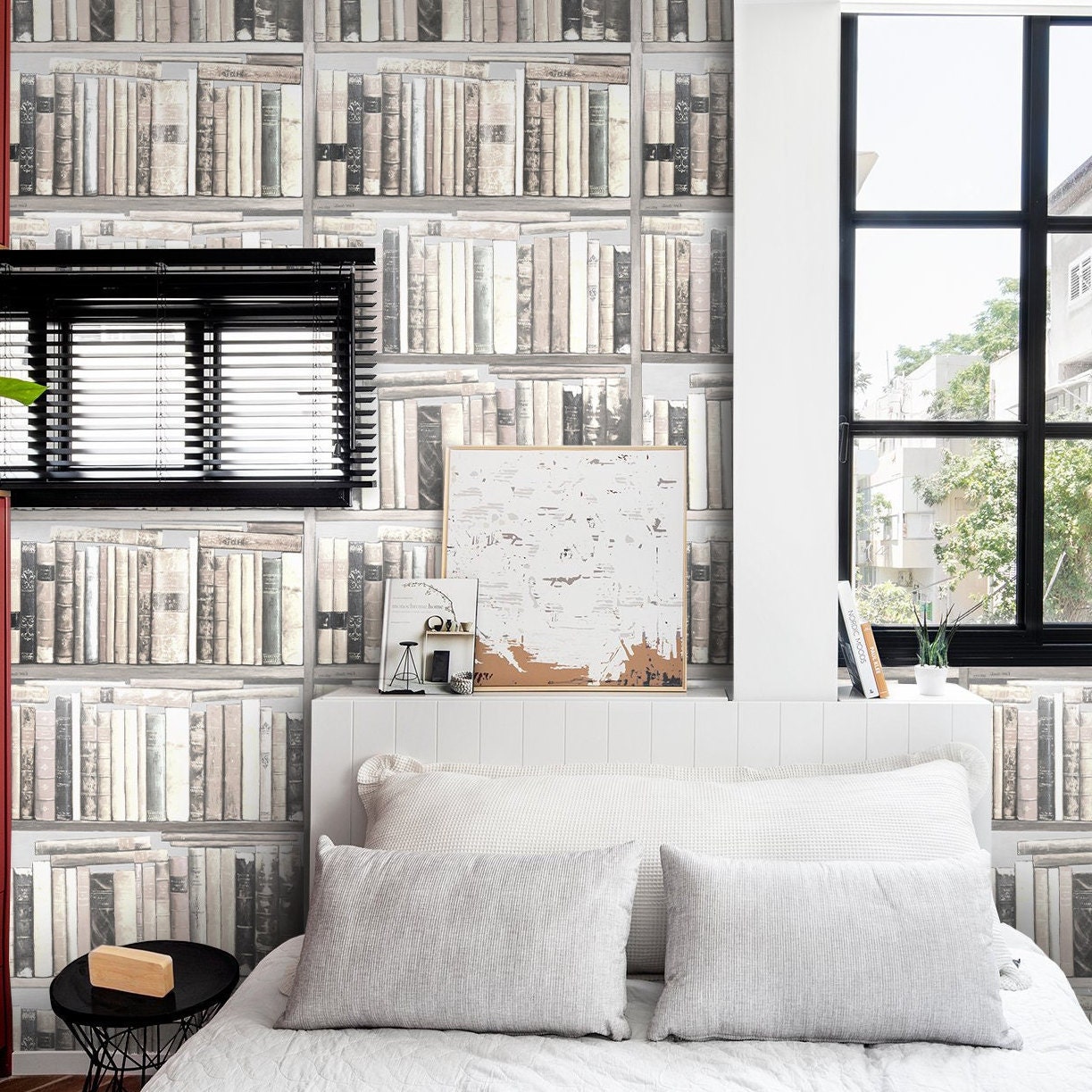 Vintage Bookshelf Wallpaper in Shades of White, Old Book Collection...