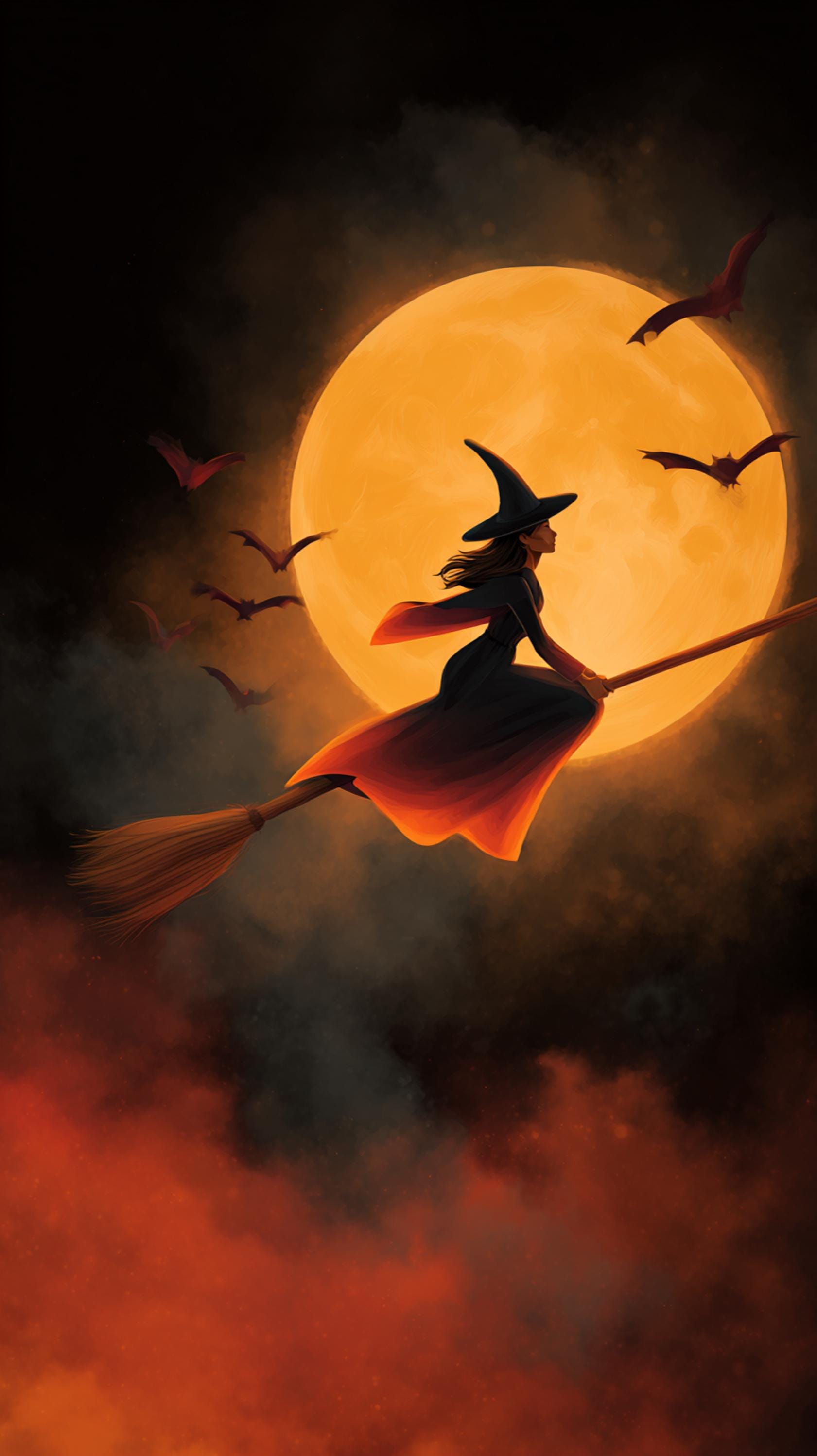Halloween Wallpaper Witch Flying on Broom, Full Moon Bats, Spooky F...