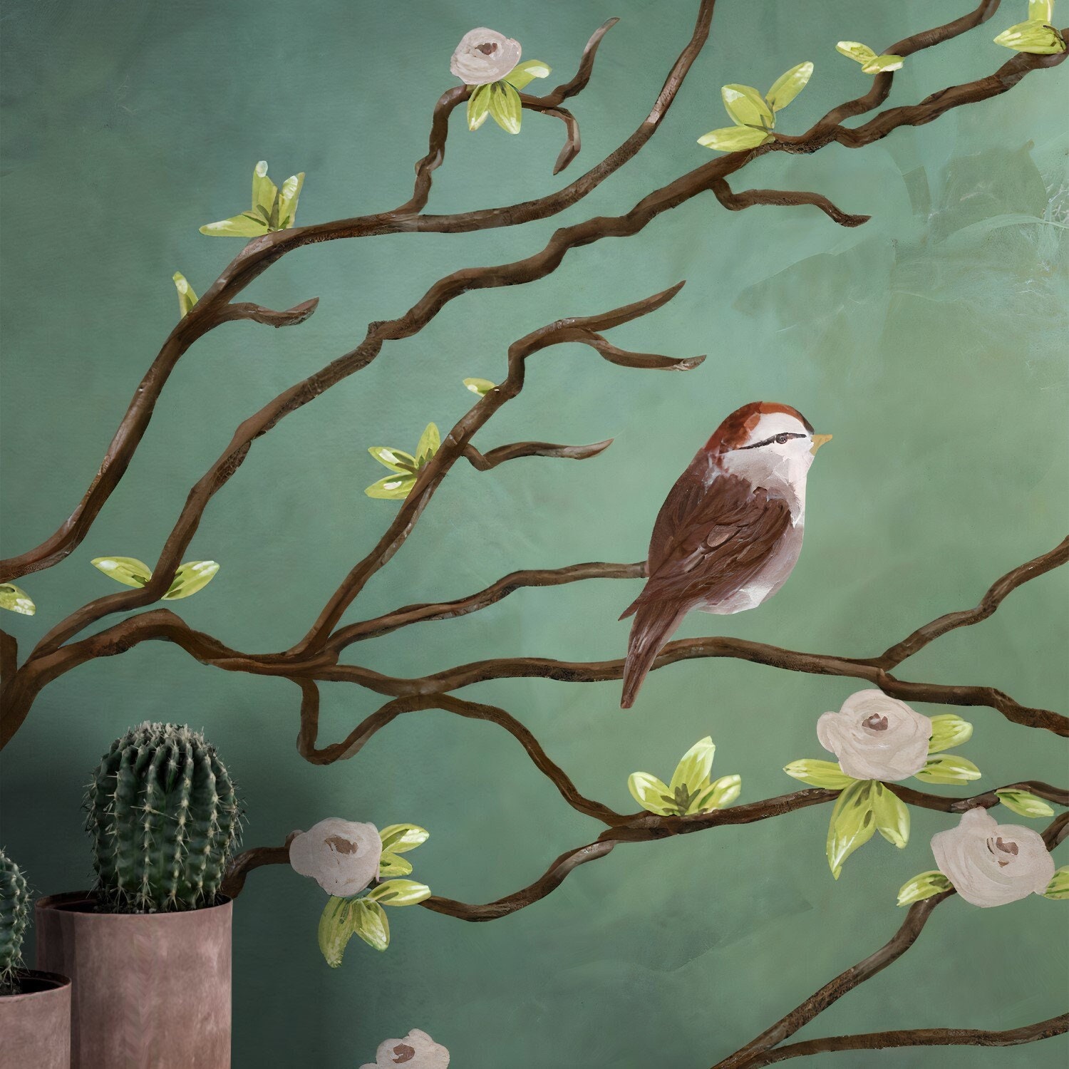 "Chinoserie Tree, Bird, Green Background Wallpaper. wallpaper Peel and Stick Wall Sticker Wall ...