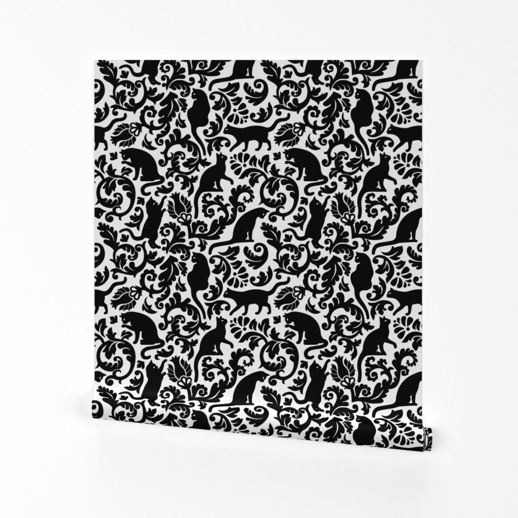 Black Cat Damask Removable Peel and Stick Wallpaper - Kitten Cat Da...
