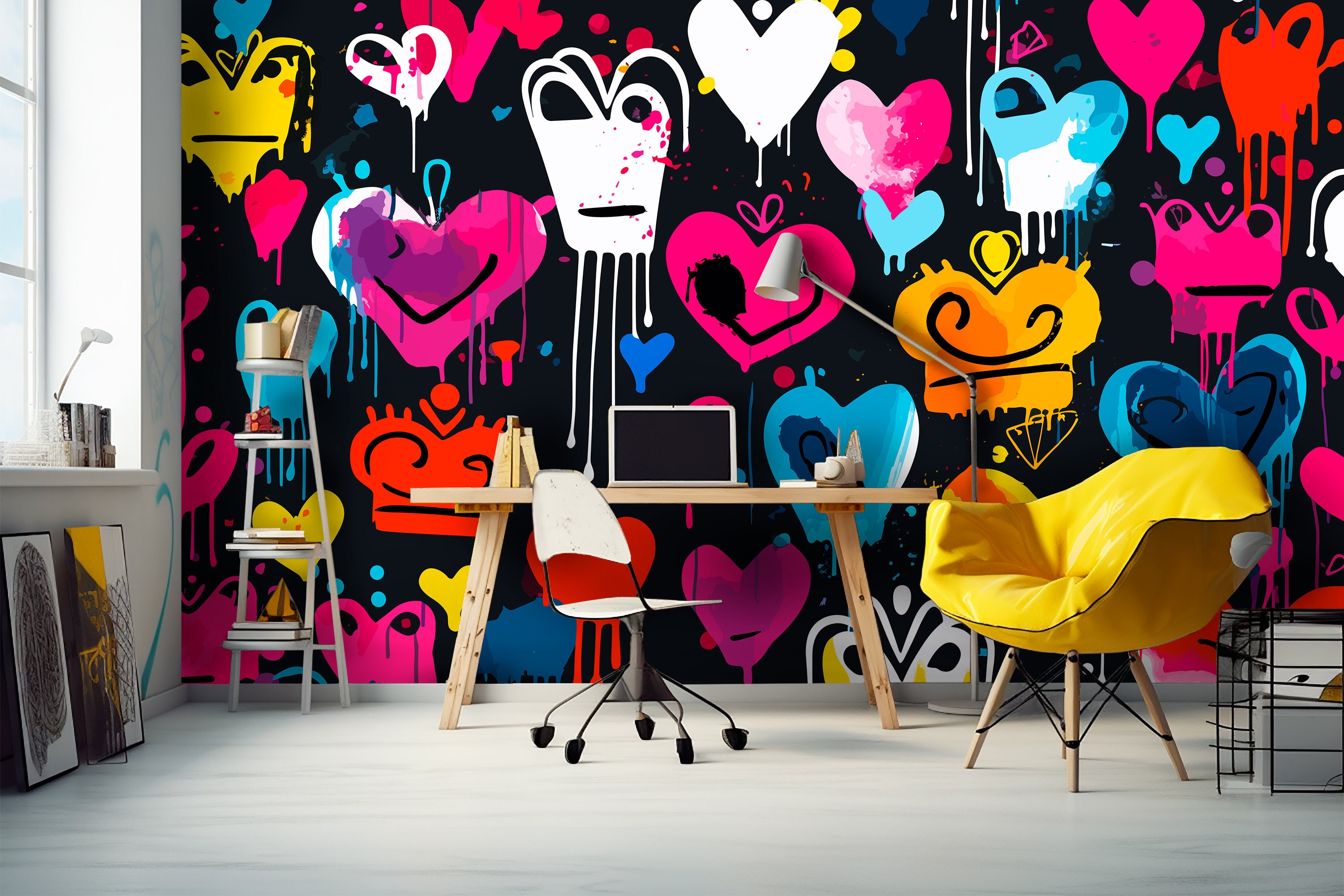 Graffiti Wallpaper Girl Bedroom, Colorful Hearts and Crowns Black M...