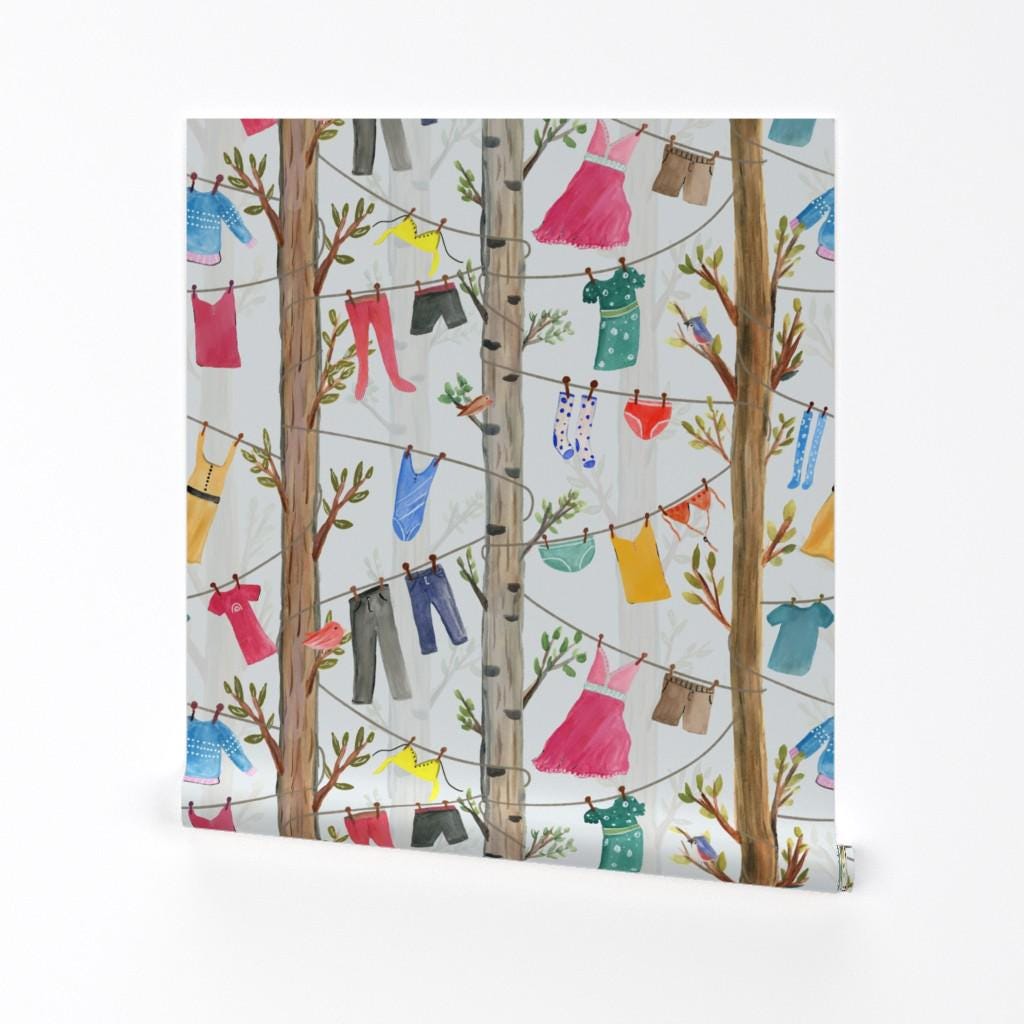Whimsical Removable Peel and Stick Wallpaper - Laundry Clothes Tree...