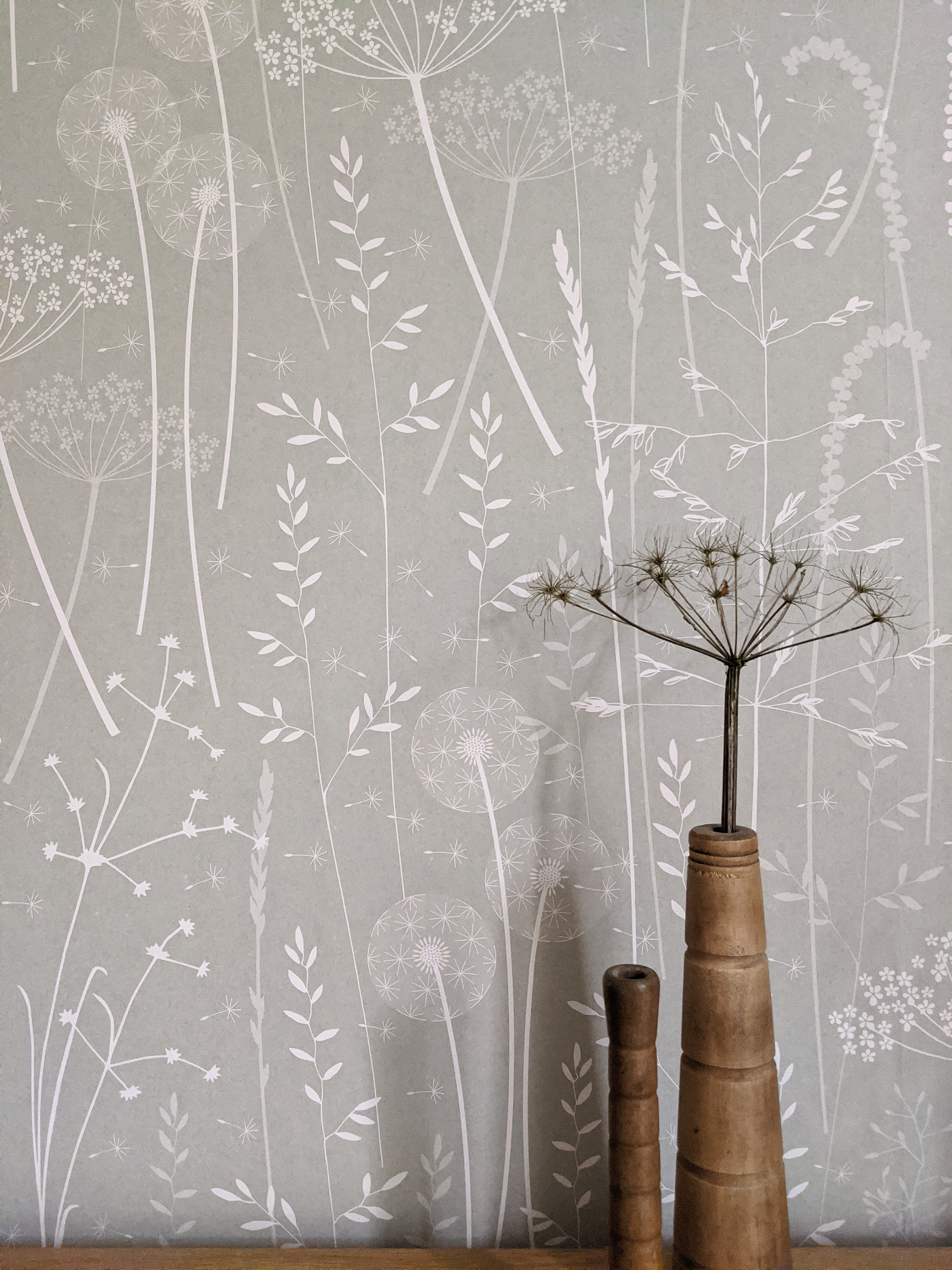 "Paper your walls with this wistful, dreamy meadow full of grasses, cow parsleys and dandelion ...