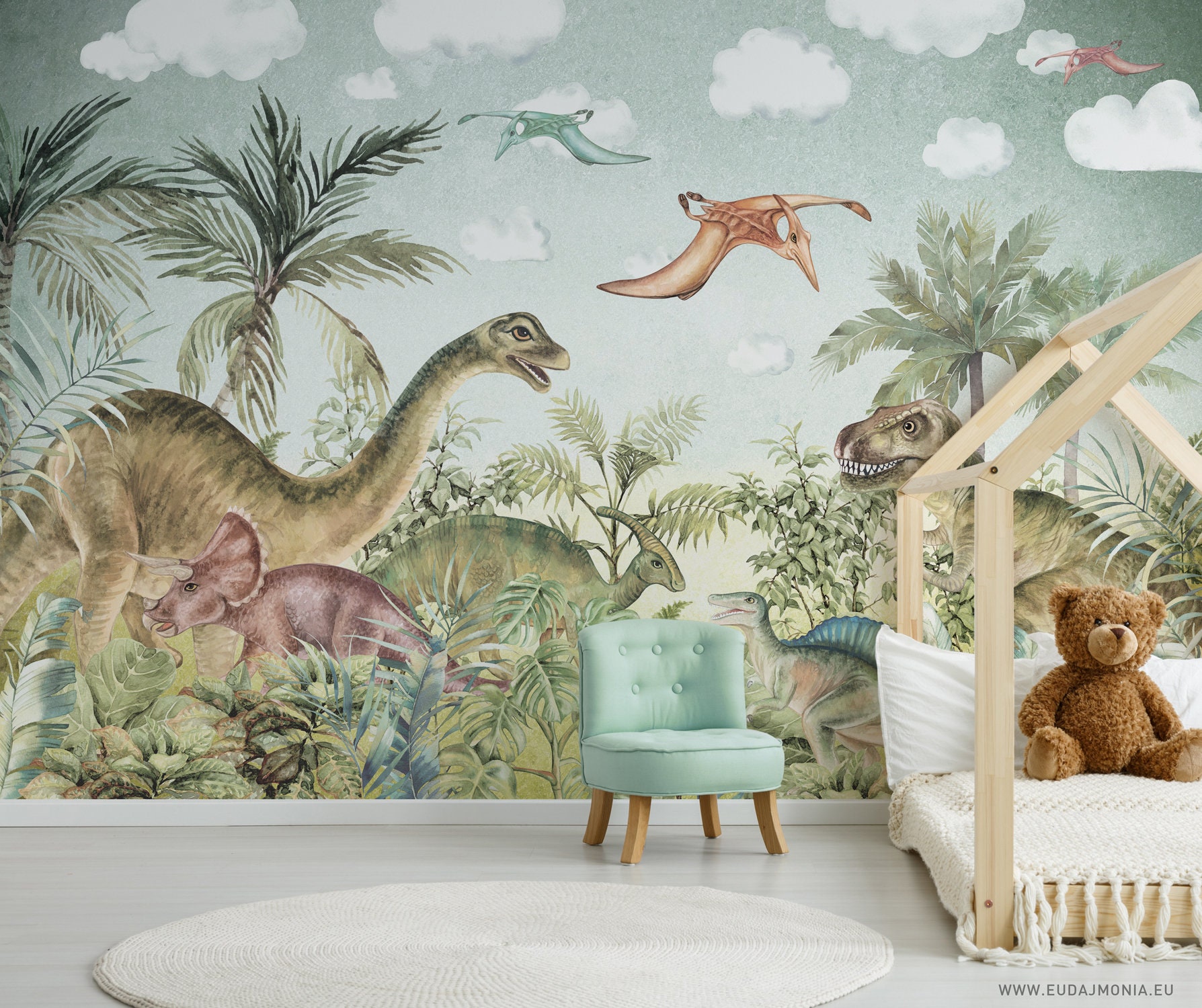A detailed dinosaur jungle mural designed for kids' rooms, nurseries and play spaces. Calm greens, n...