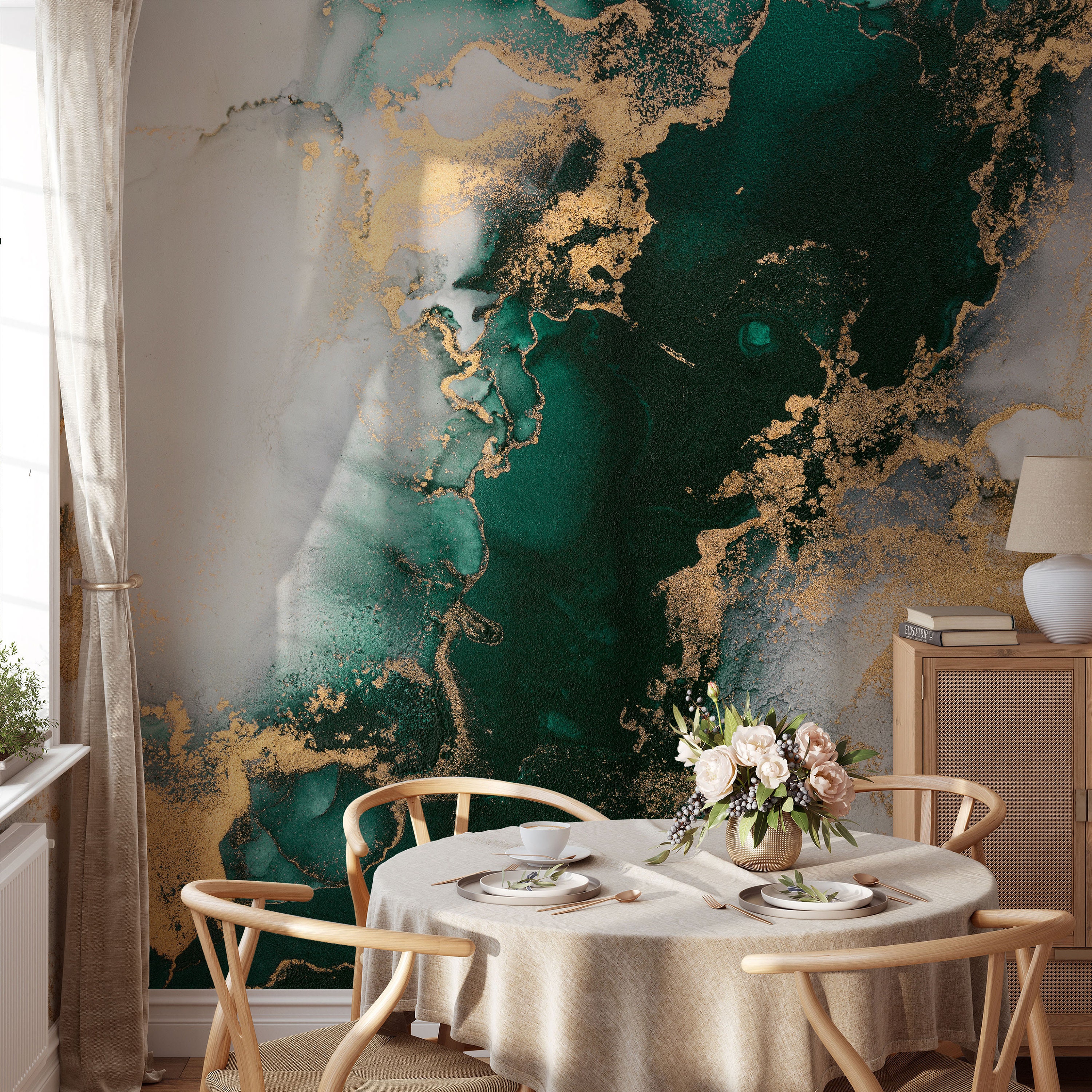 The dark green marble wallpaper is showcased in a beautiful and elegant design. The deep and rich gr...