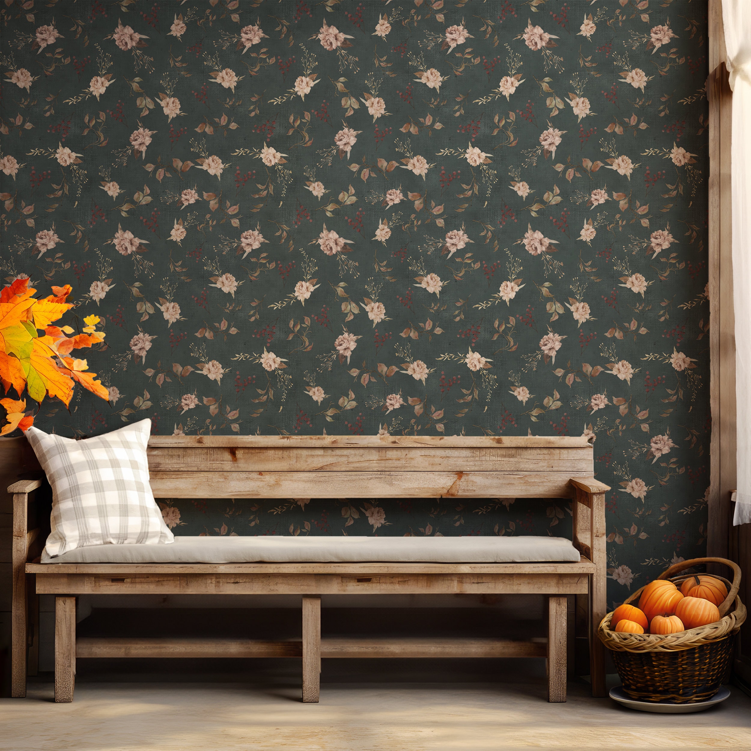 "Removeable moody dark floral wallpaper featuring a weathered linen textured background, infusi...
