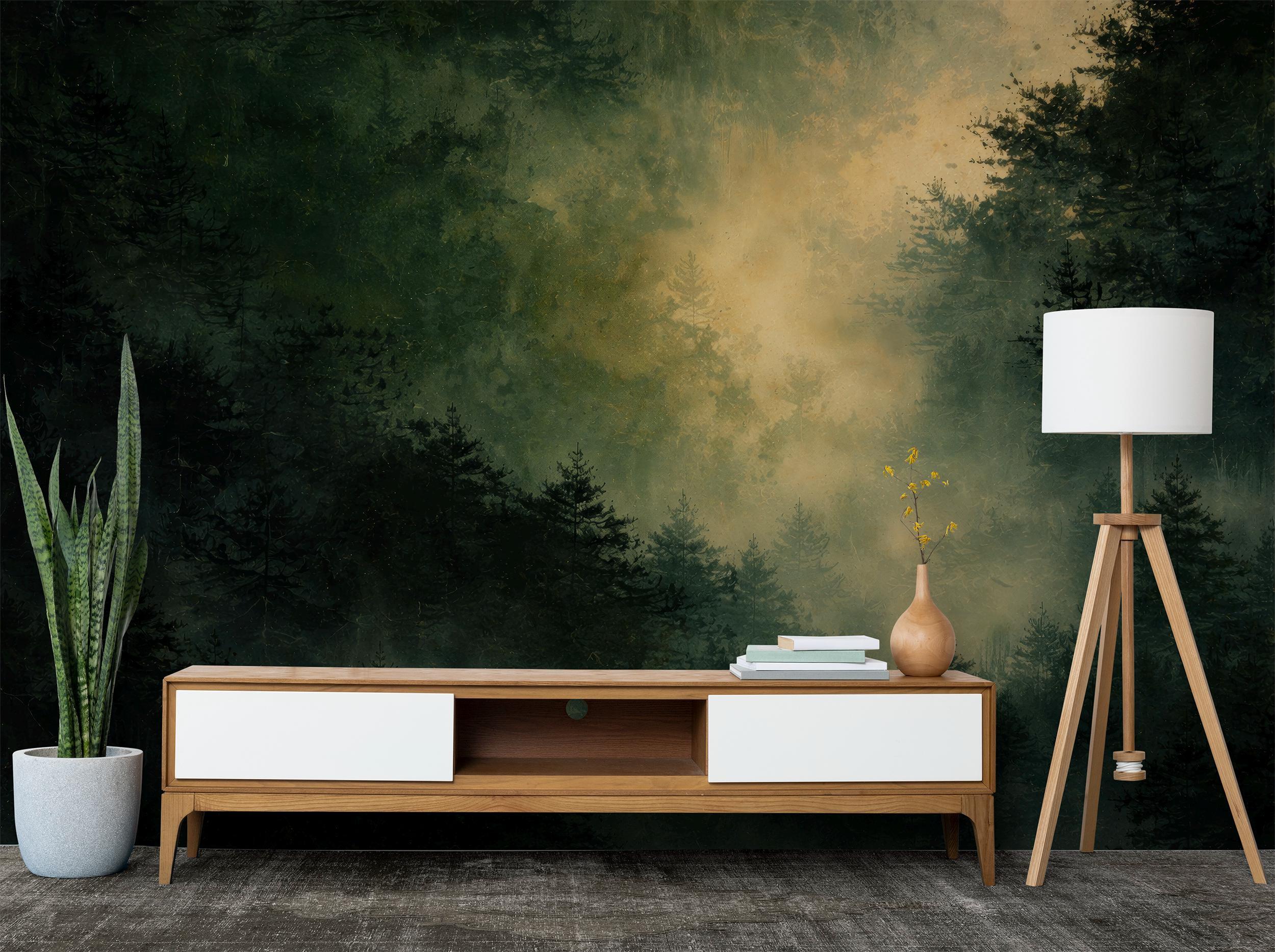 "Moody forest wallpaper mural. Inspired by misty woodlands and rich green tones, this design cr...