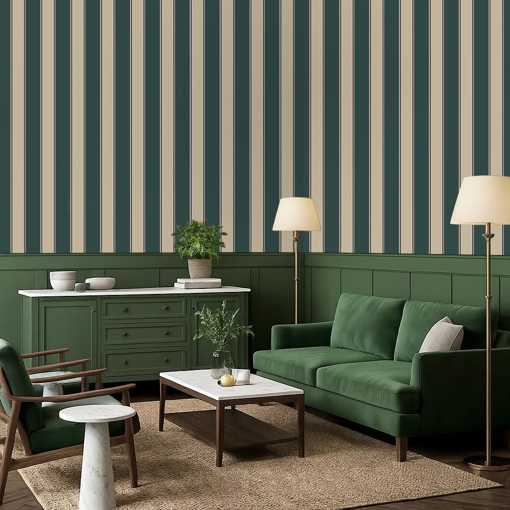 "Green vertical stripe wallpaper, designed to bring structure, balance, and classic charm to an...