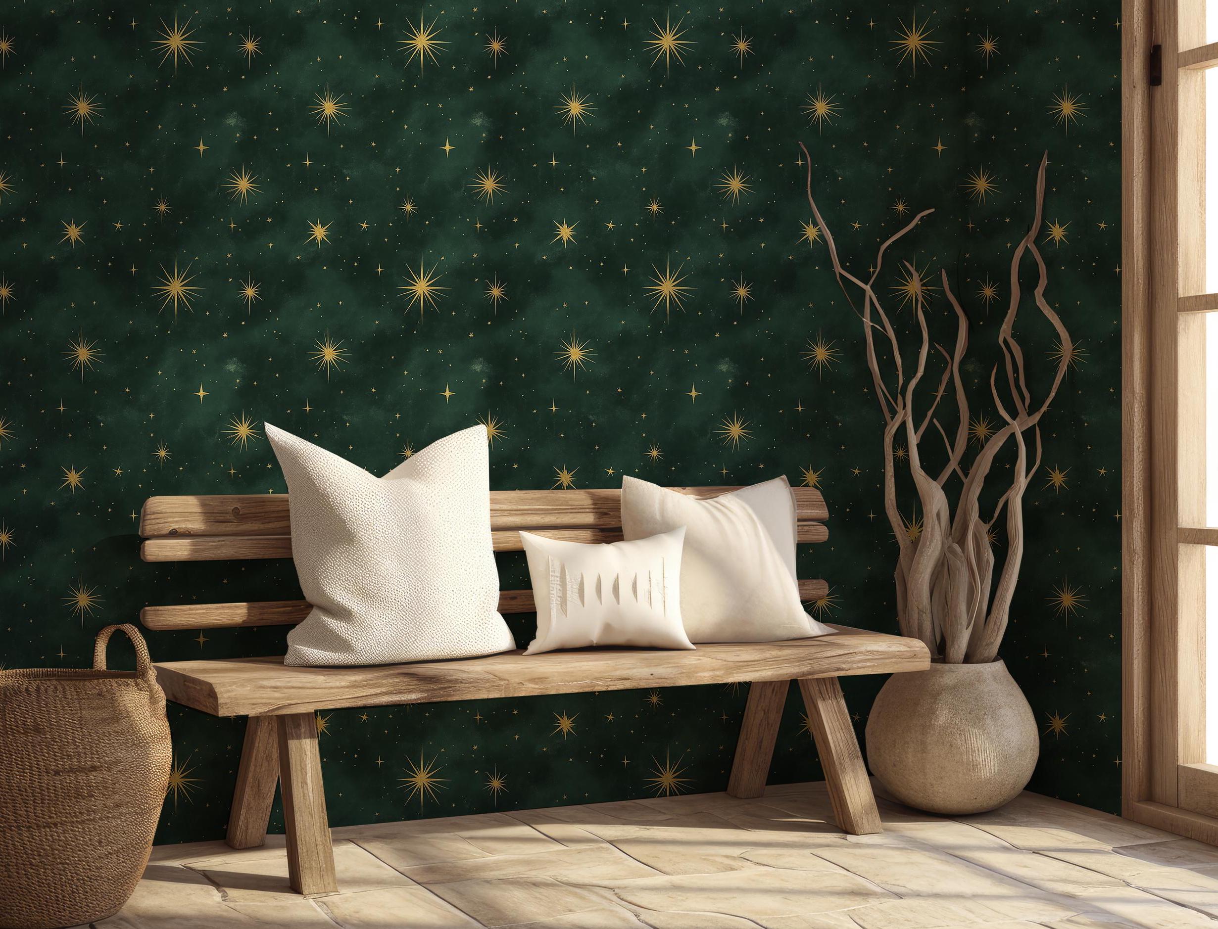 THIS PRODUCT IS NOT METALLIC OR GOLD ONLY GRADIENT COLOR PRINTING! Celestial Green & Star Wallpa...