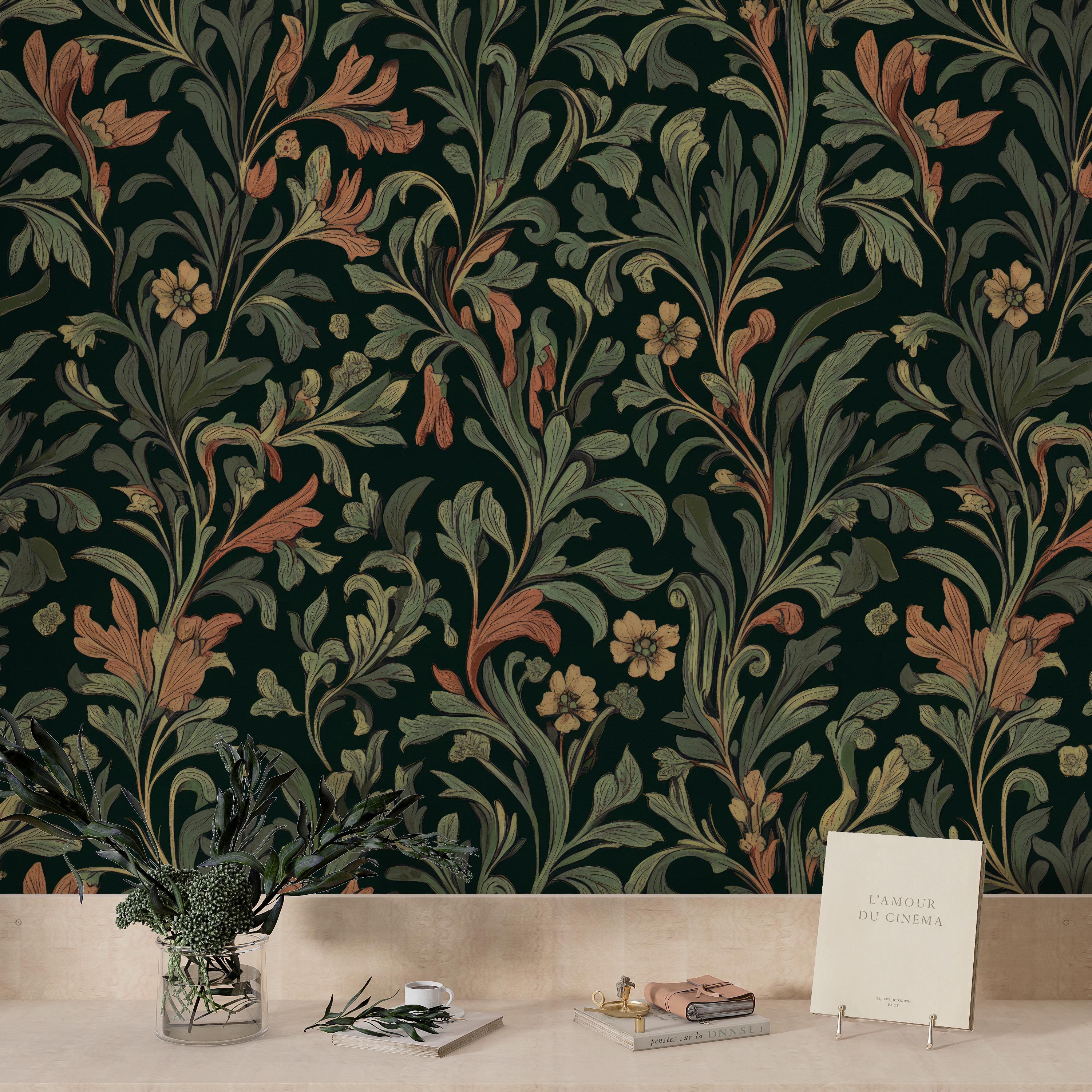 Wallpaper Victorian Floral, Dark Green & Rust, Elegant Botanica...