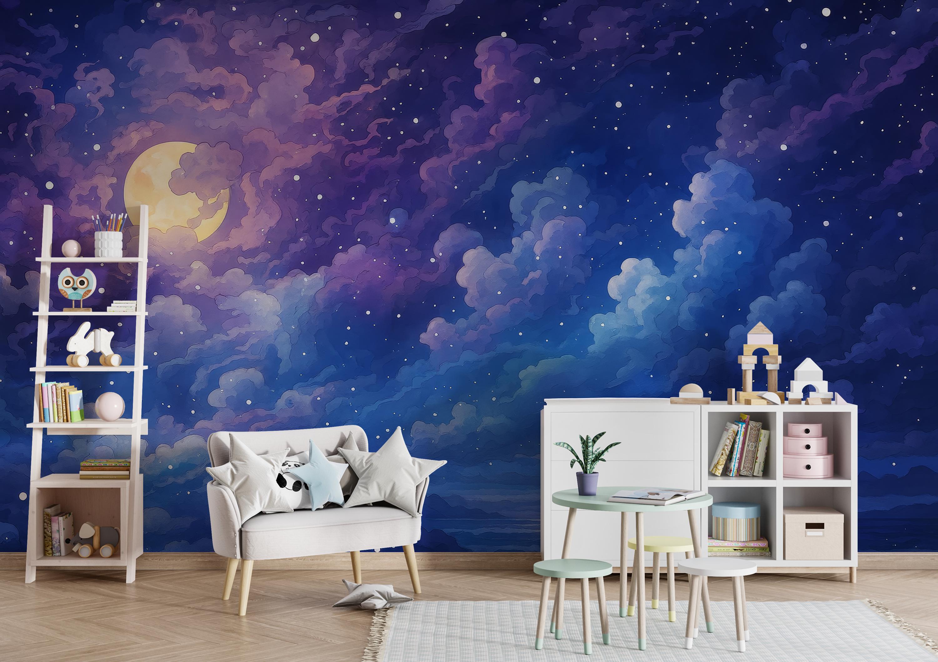 Space mural wallpaper. Featuring deep blues, purples, and twinkling stars, this night sky wallpaper ...