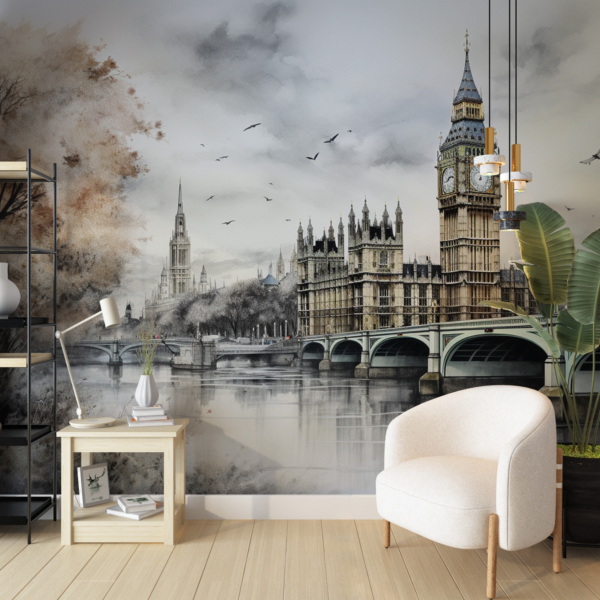 London Big Ben Wallpaper, Watercolor Art Landcape Mural Decor for H...