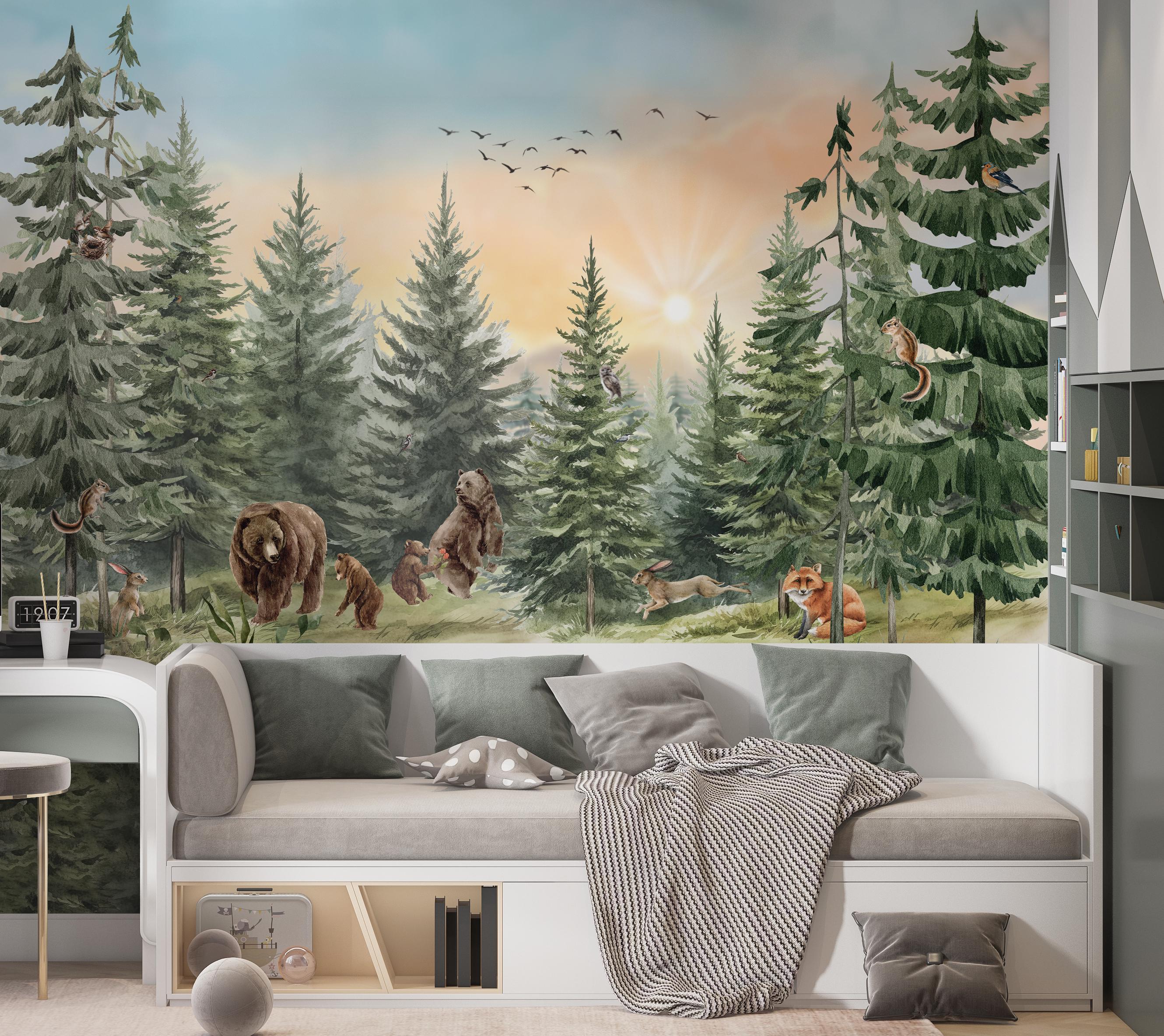 Sunrise Forest Animal Wallpaper, Bear Family Woodland Mural, Fox Ra...