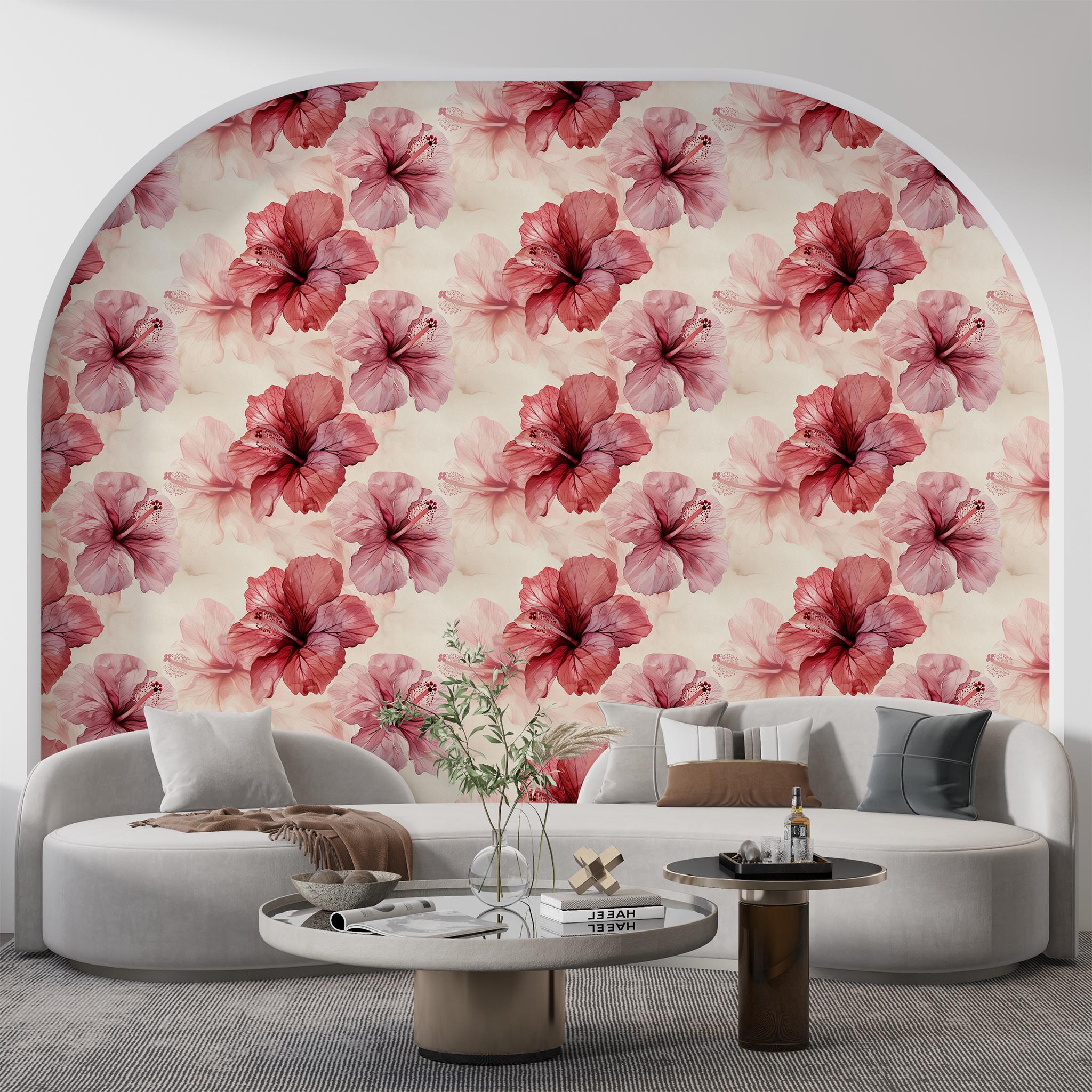 Red Hibiscus Flowers Wallpaper, Japenese Flower Designed Wall Mural...