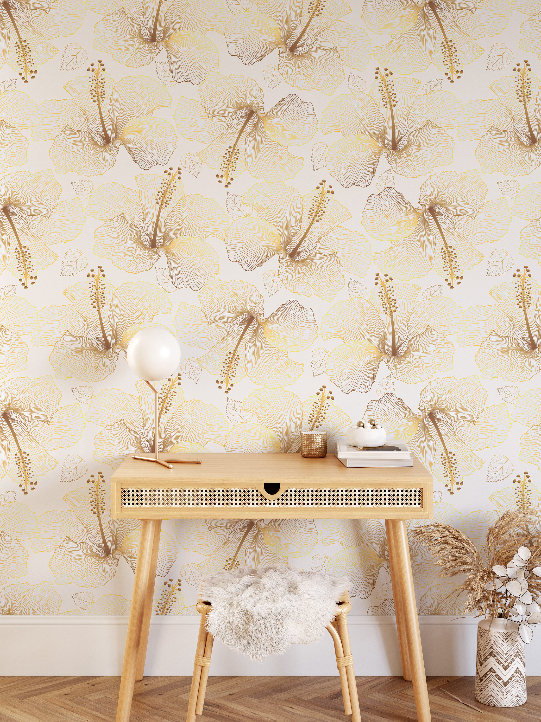 Golden Hibiscus Flowers Wallpaper, Floral Wall Art, Renters Wallpap...