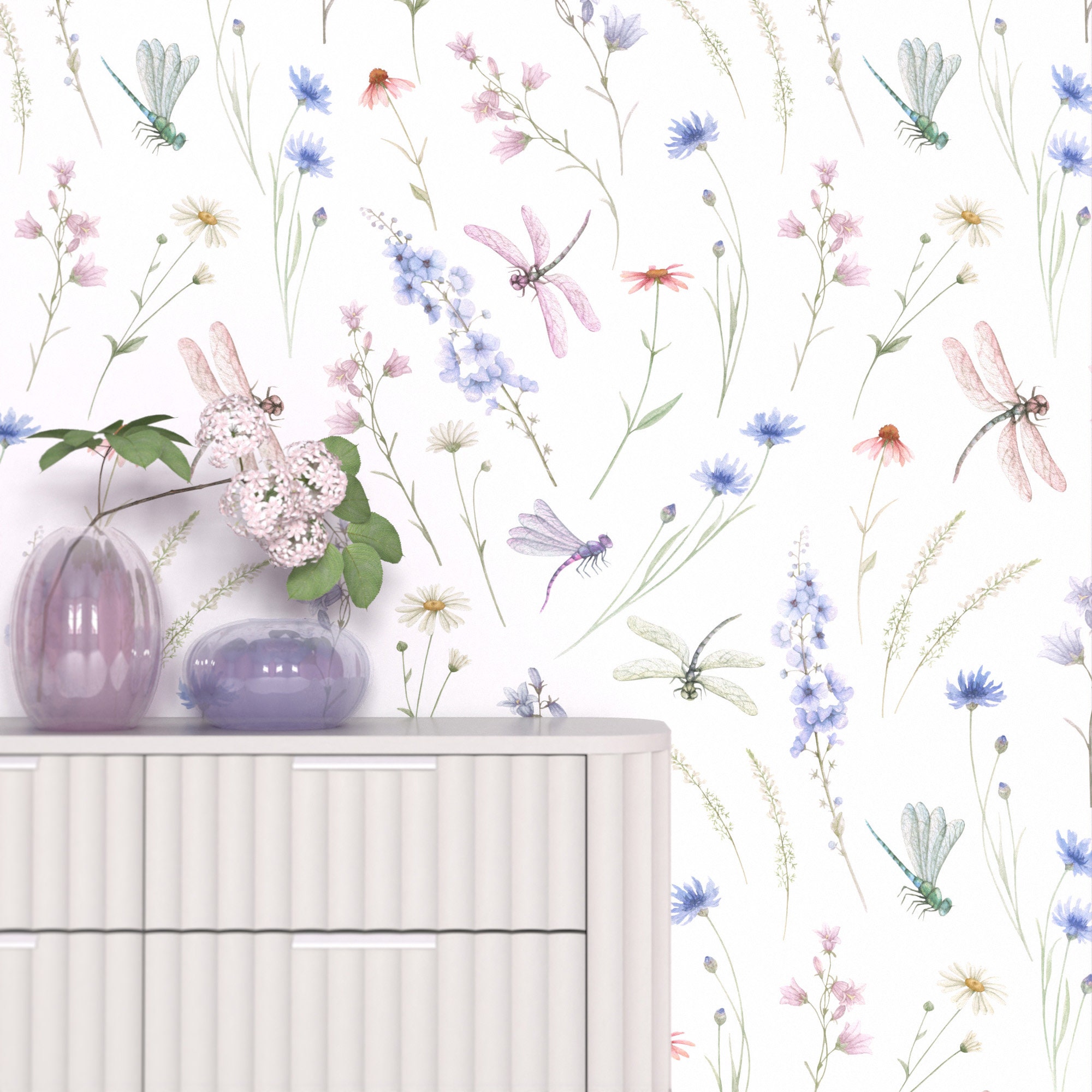 Wallpaper Roll Dragonfly on Plant Flower, Watercolor Wildflower Wal...