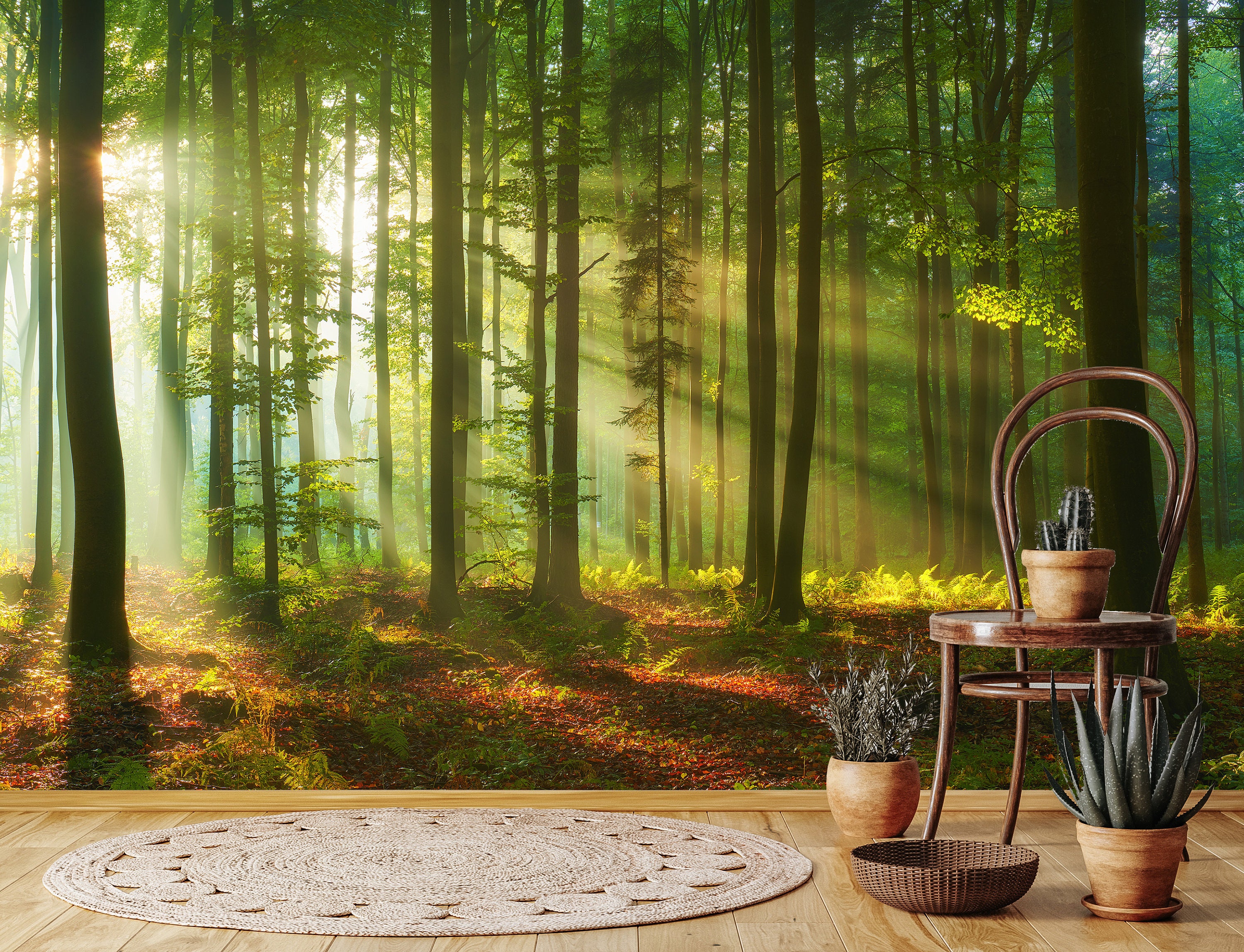 Woodland Wallpaper with God Beams, Peel and Stick | Forrest Wall Mu...