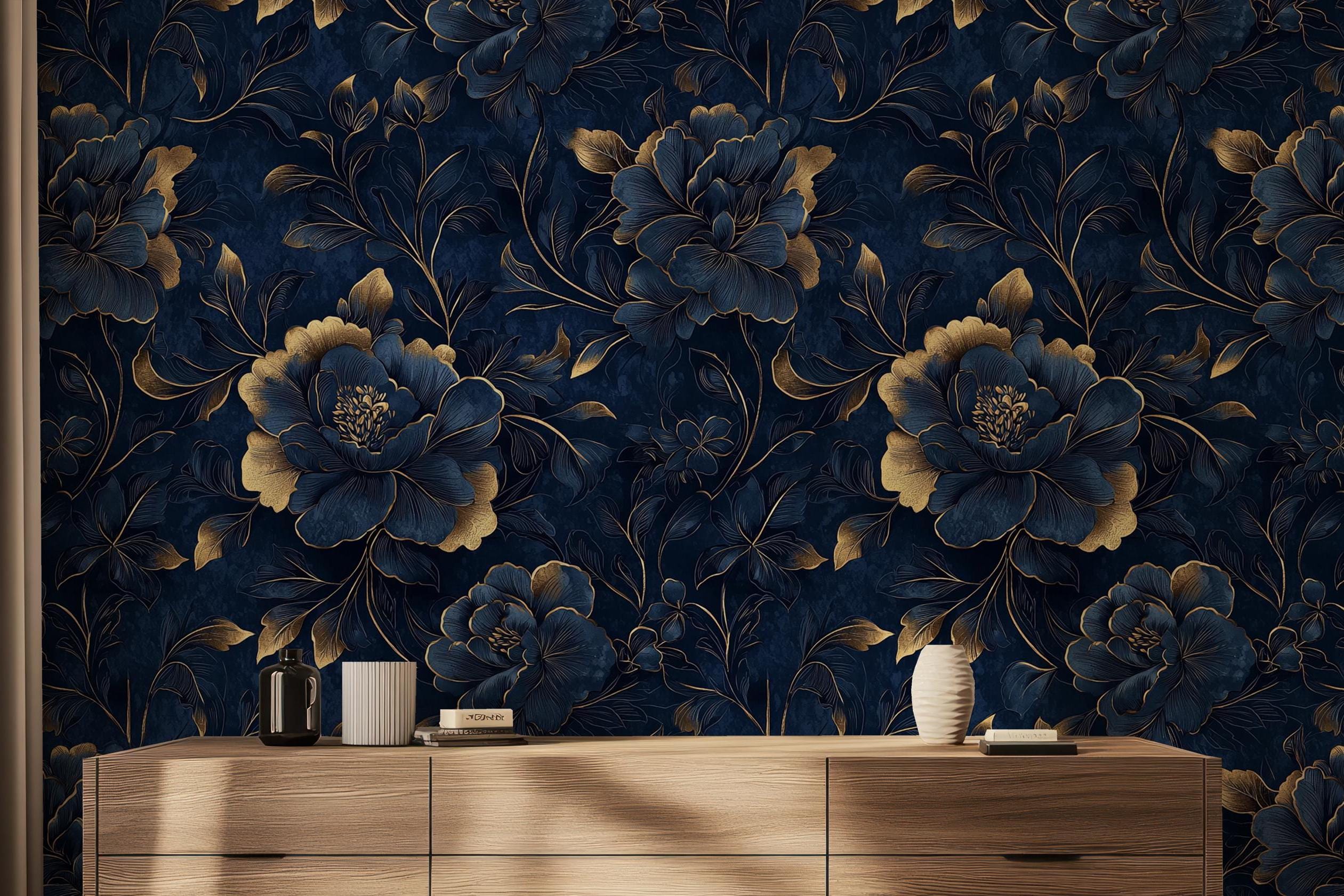 Navy Blue Gold Floral Wallpaper | Drawn Peony Flowers Wallpaper | B...