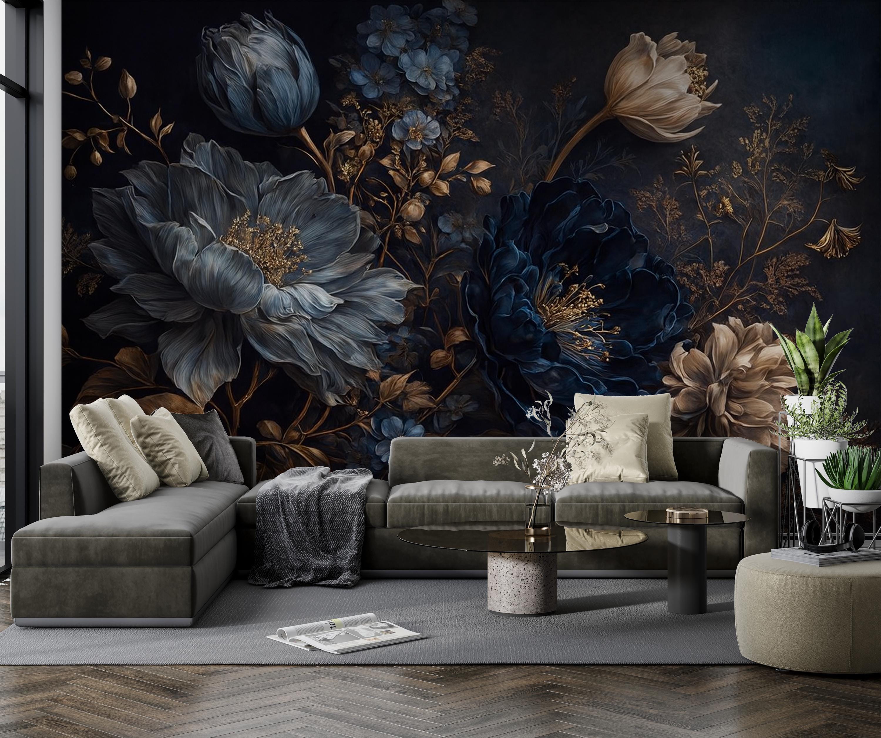 Midnight Blue Floral Wallpaper - Elegant, Moody & Luxurious Elevate your space with this breatht...