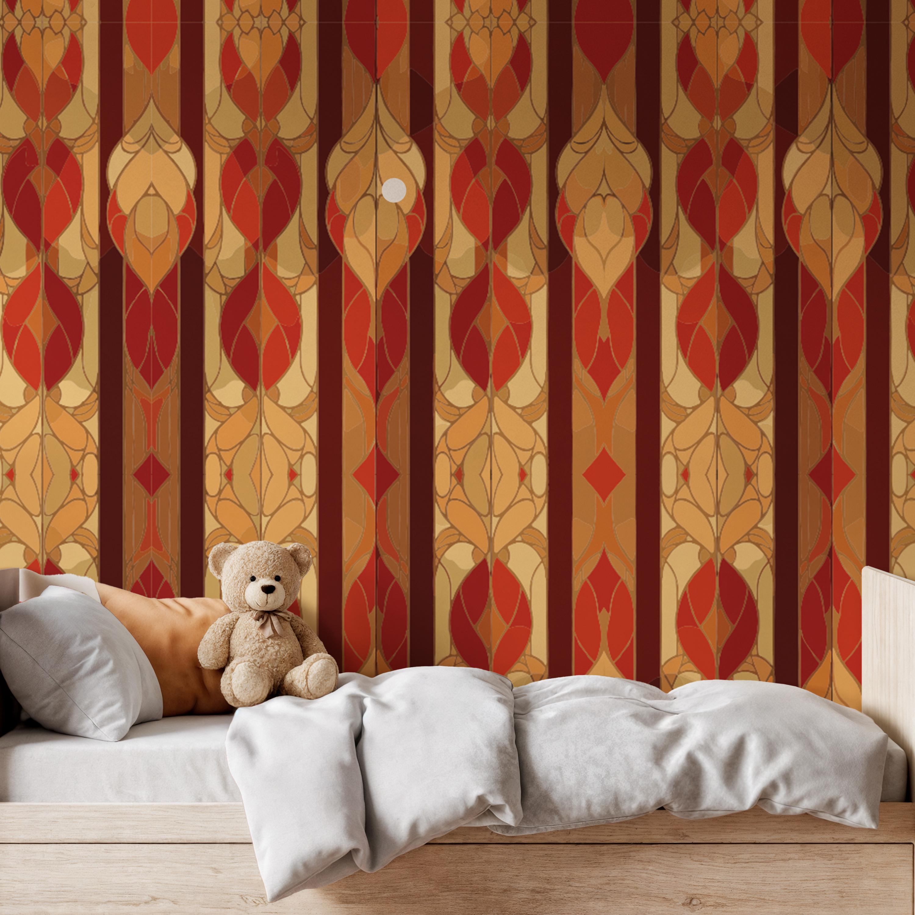 Red Gold Floral Wallpaper, Nouveau Peel Wallpaper, Stripe Wall Mura...