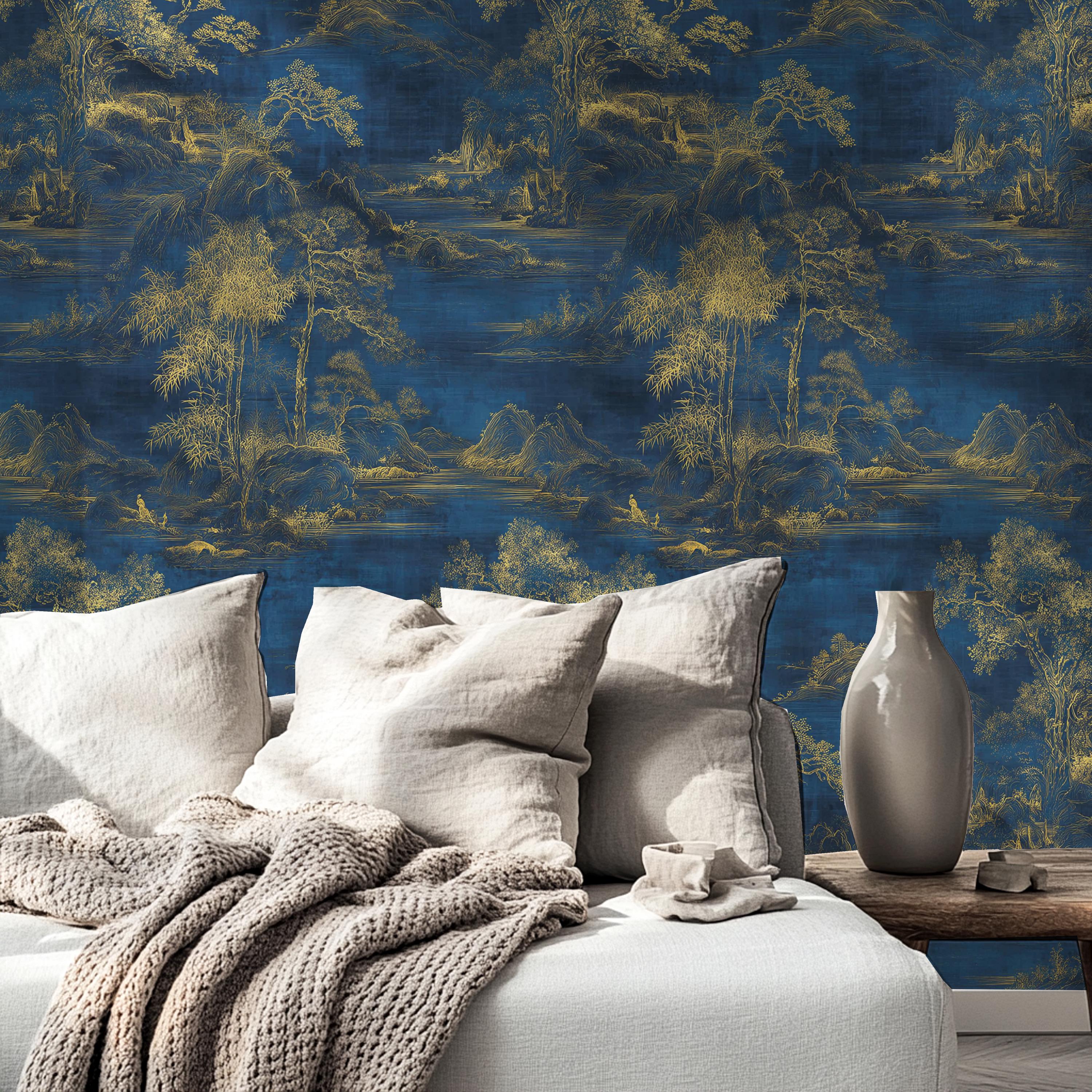 Dark Blue & Gold Landscape Chinoiserie Wallpaper - Elegant Nature Wall Mural Bring timeless eleg...