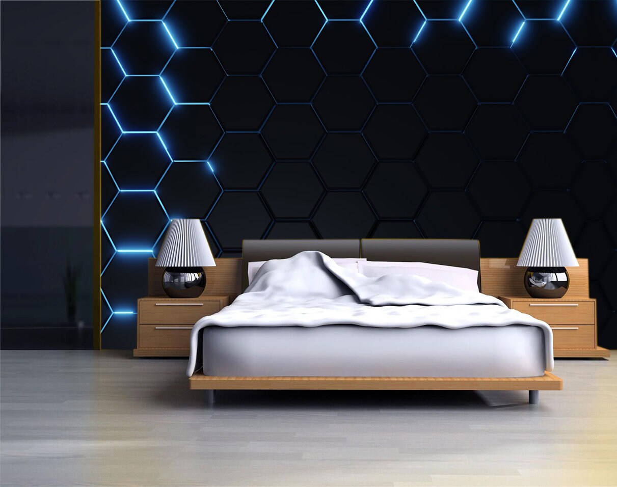 Hexagon Geometric Wall Mural Modern Neon Futuristic Wallpaper Gamin...