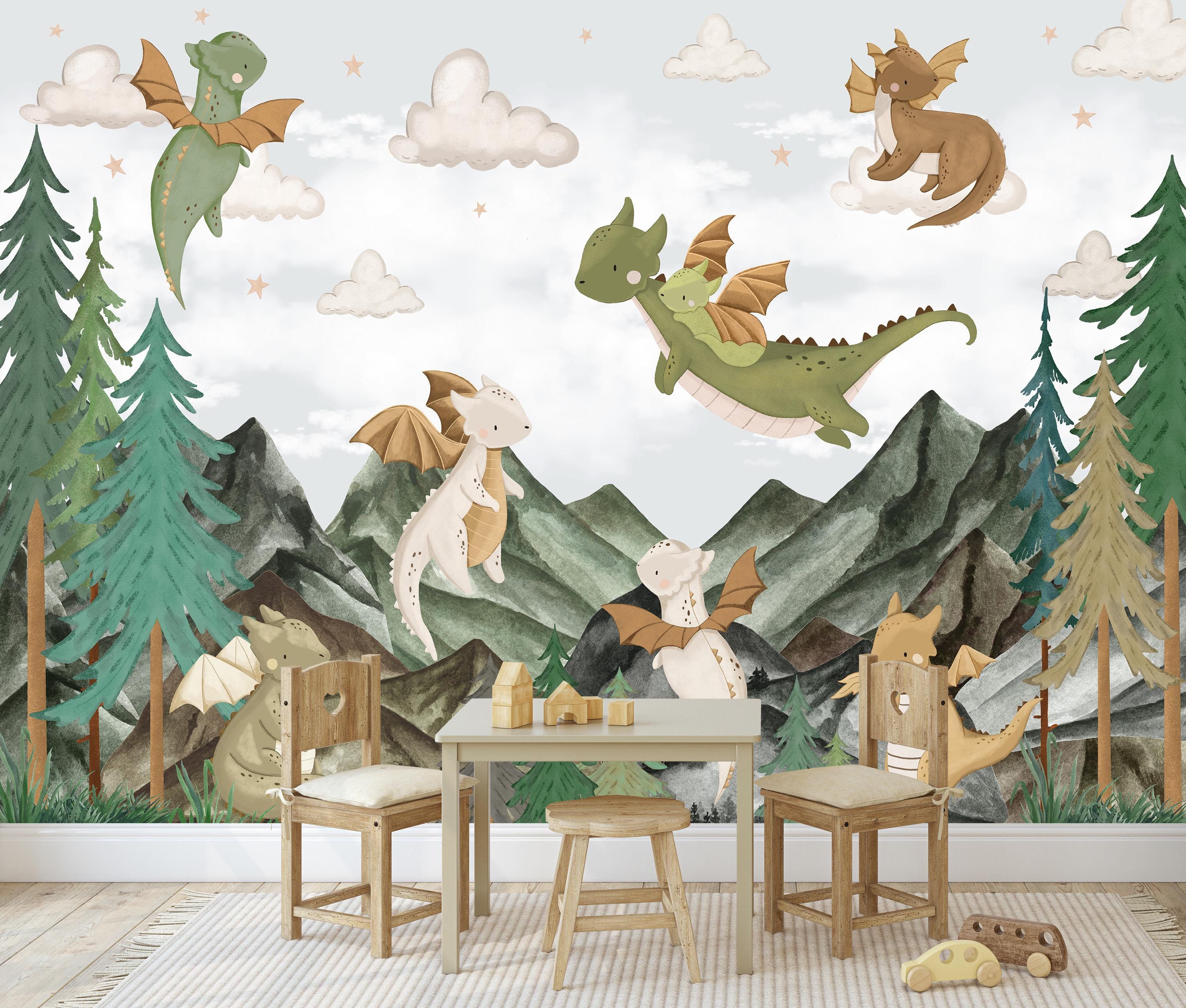 Nursery Dragon Wallpaper, Peel and Stick Dragon Wall Mural, Kids Dr...