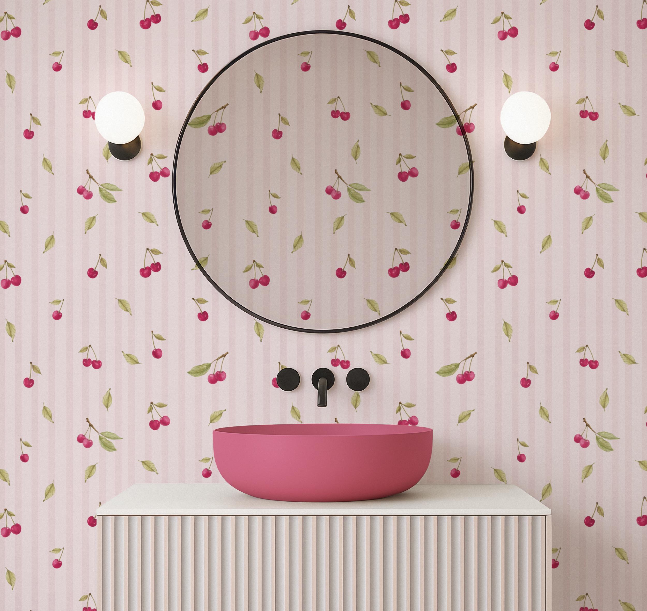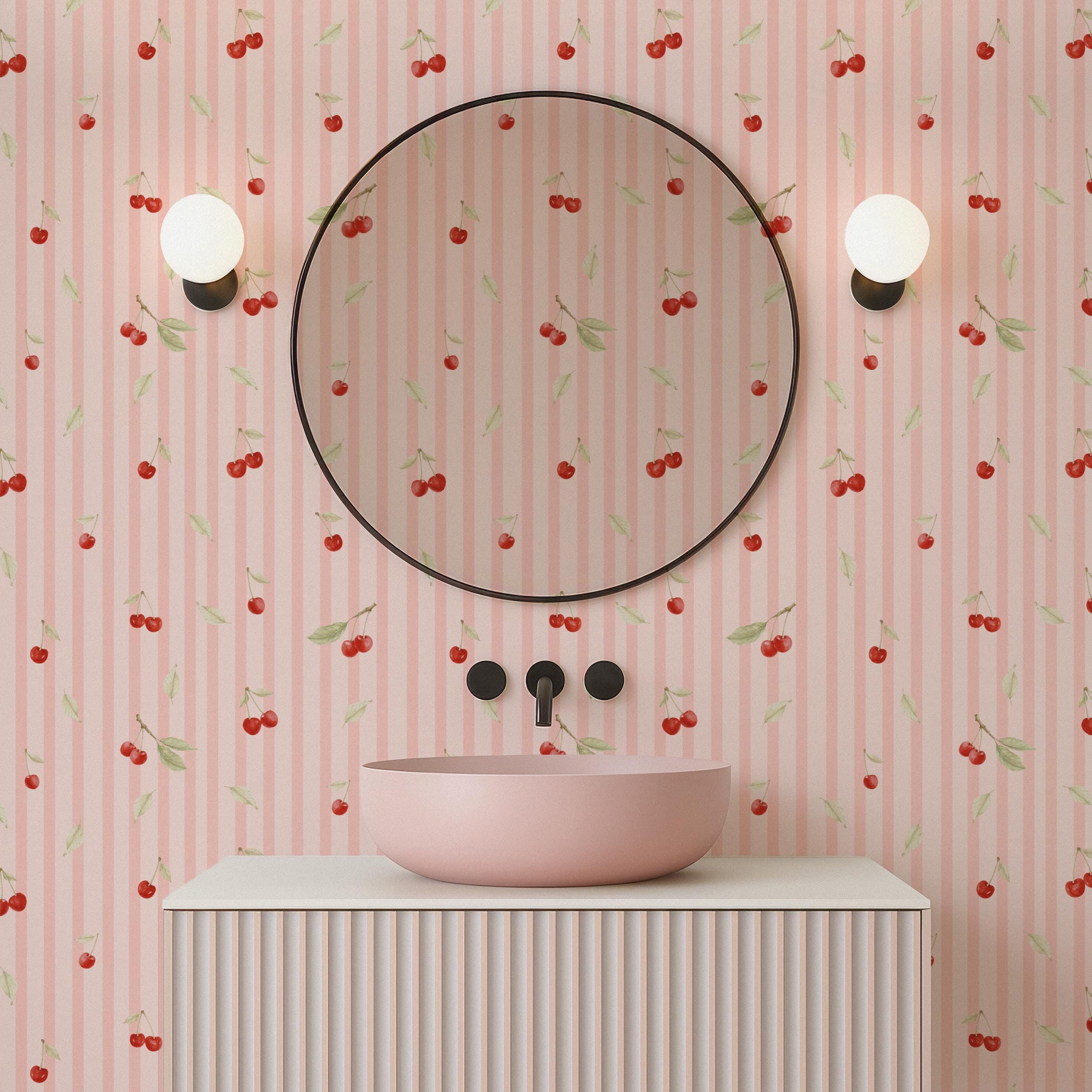 Pink cherry wallpaper! Inspired by 80s aesthetics, this fun vinyl wallpaper features vibrant cherrie...