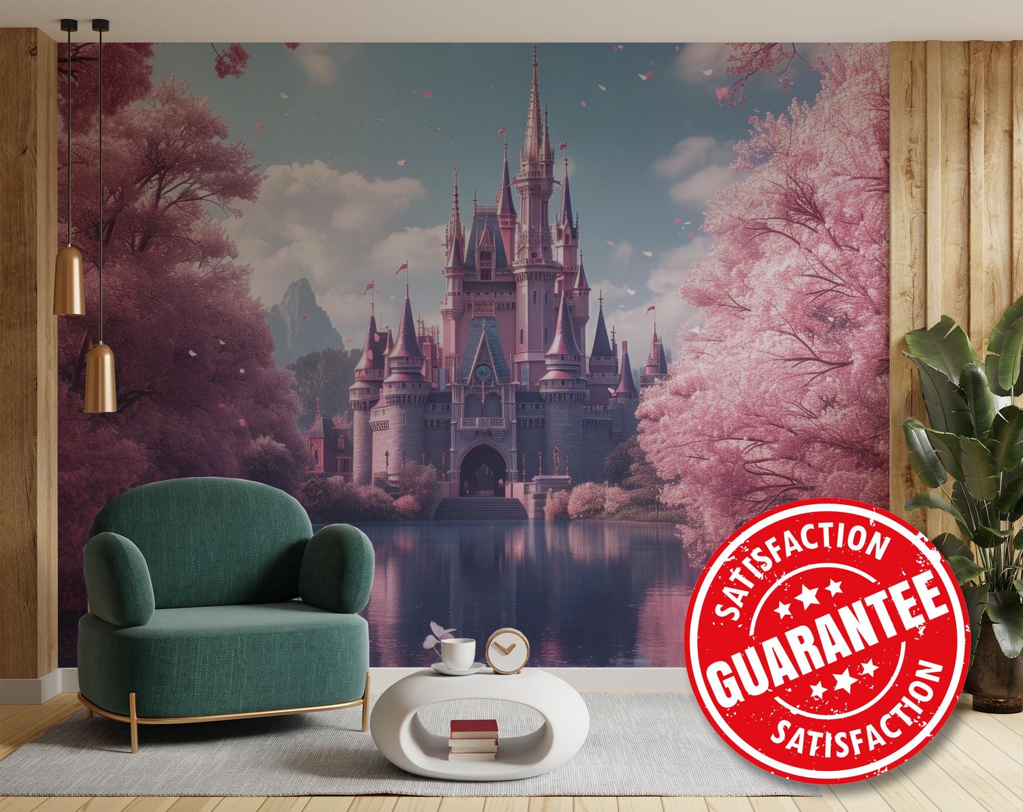 Pink Castle with Lake removable mural / Peel and stick Lake Castle ...