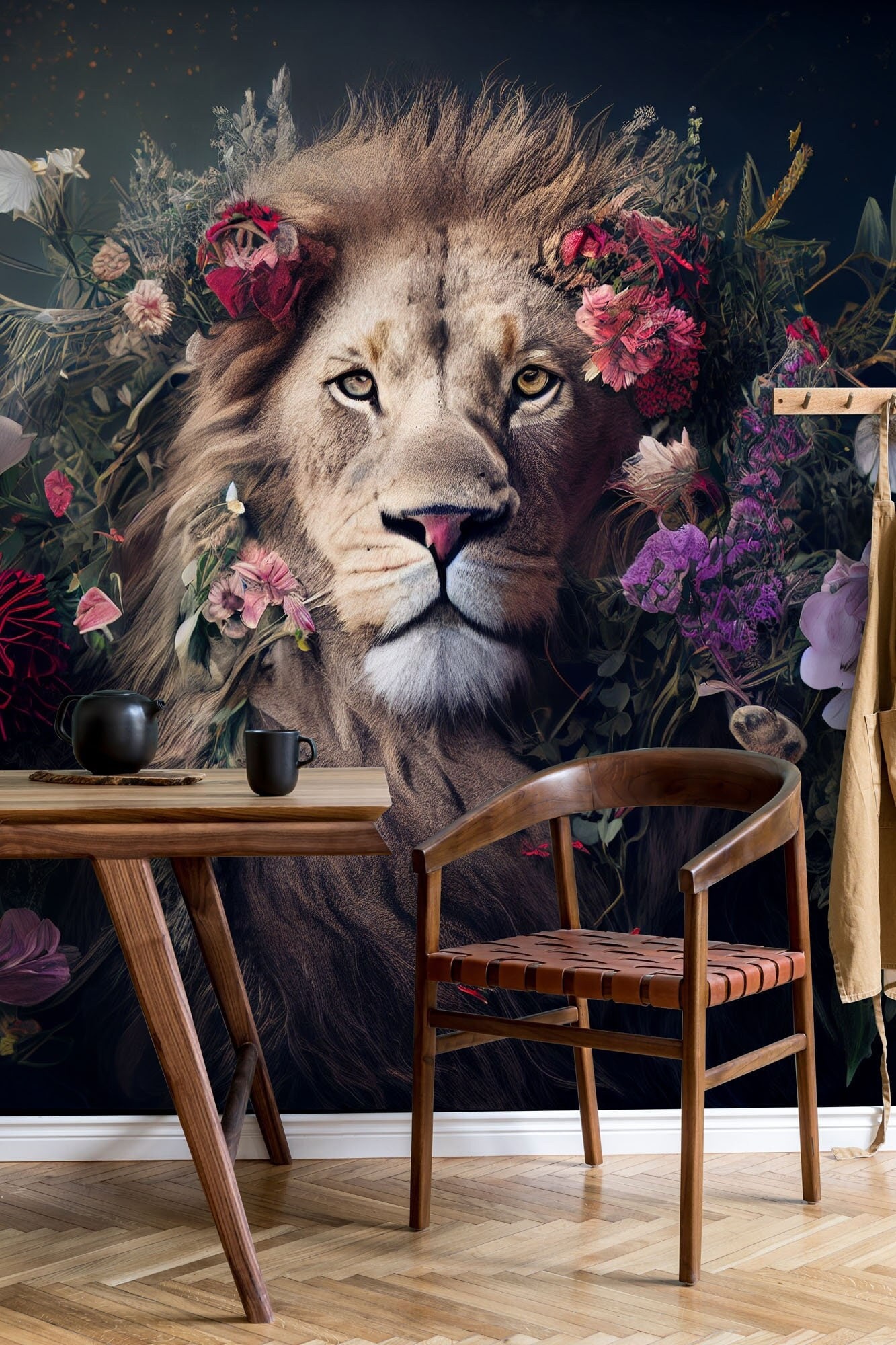 Lion animal wallpaper with flowers and leaves | Wall Decor | Home Renovation | Wall Art | Peel and S...