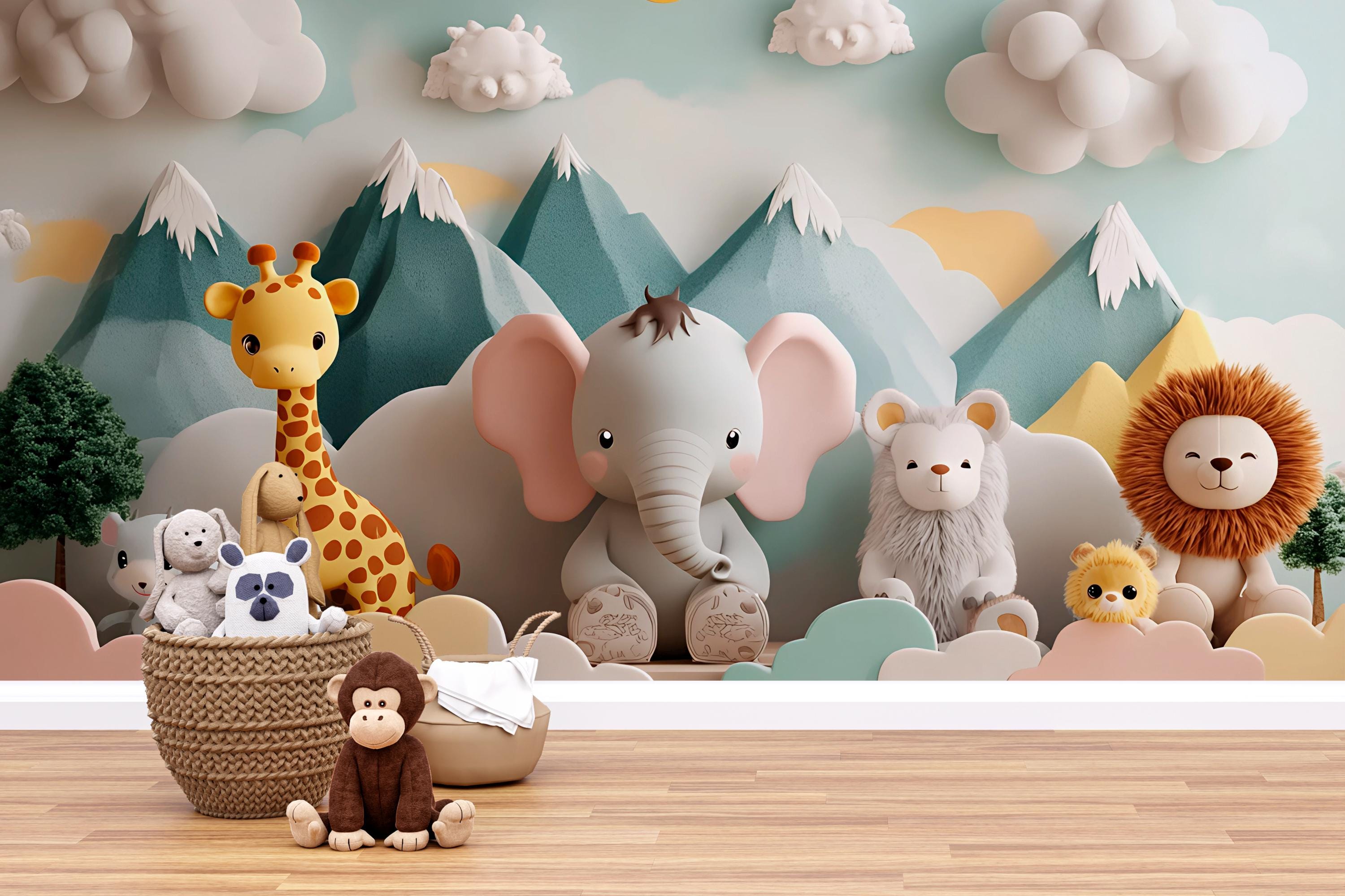 3D Jungle Safari Animal Nursery Wall Mural - Elephant, Giraffe, Lion Baby Room Wallpaper - Gender Ne...