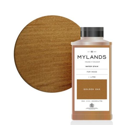 The product is a 250ml container of Mylands Golden Oak wood stain, formulated with a matte sheen fin...