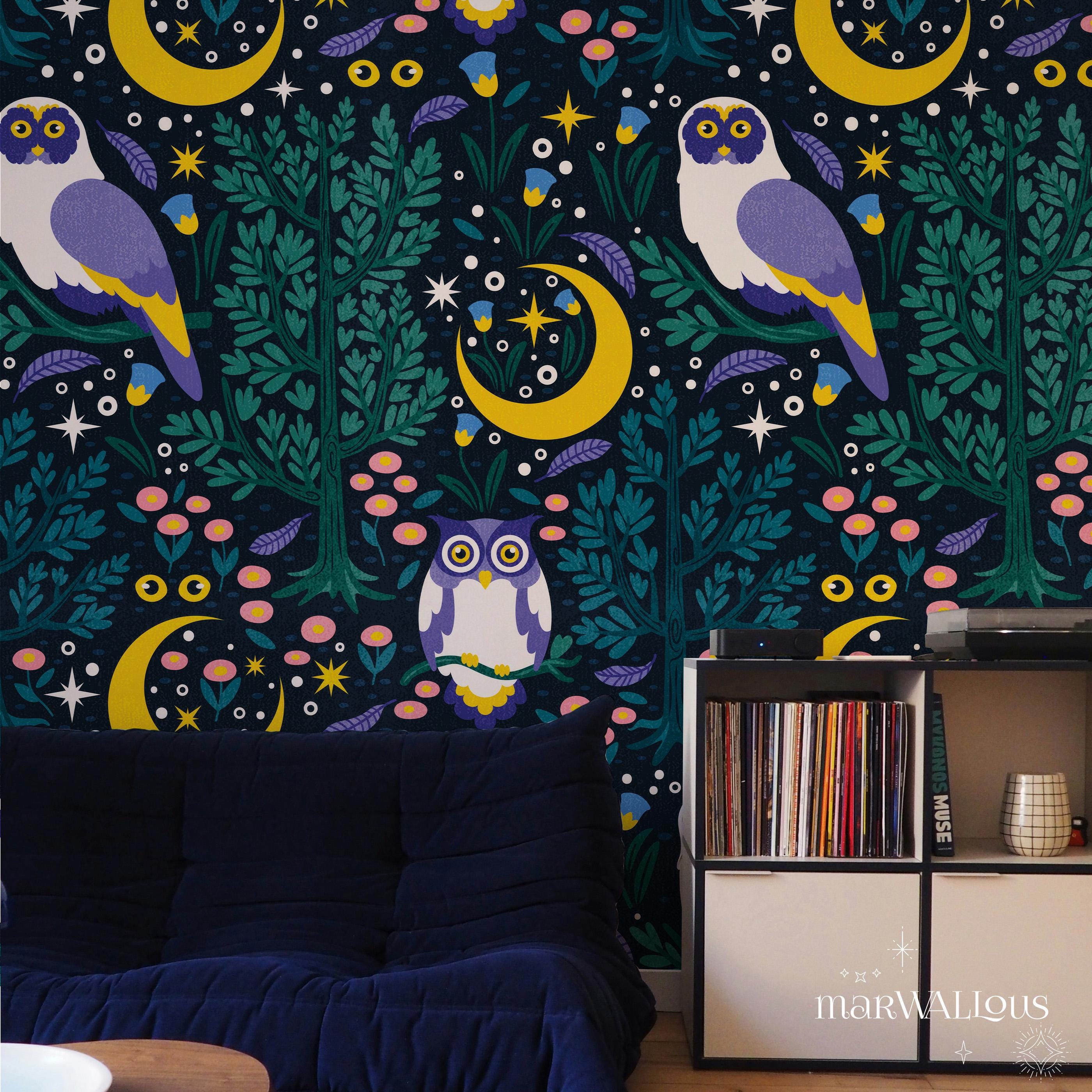 Owl Wallpaper, Night Sky Nursery Decor, Moon and Stars Mural, Whims...