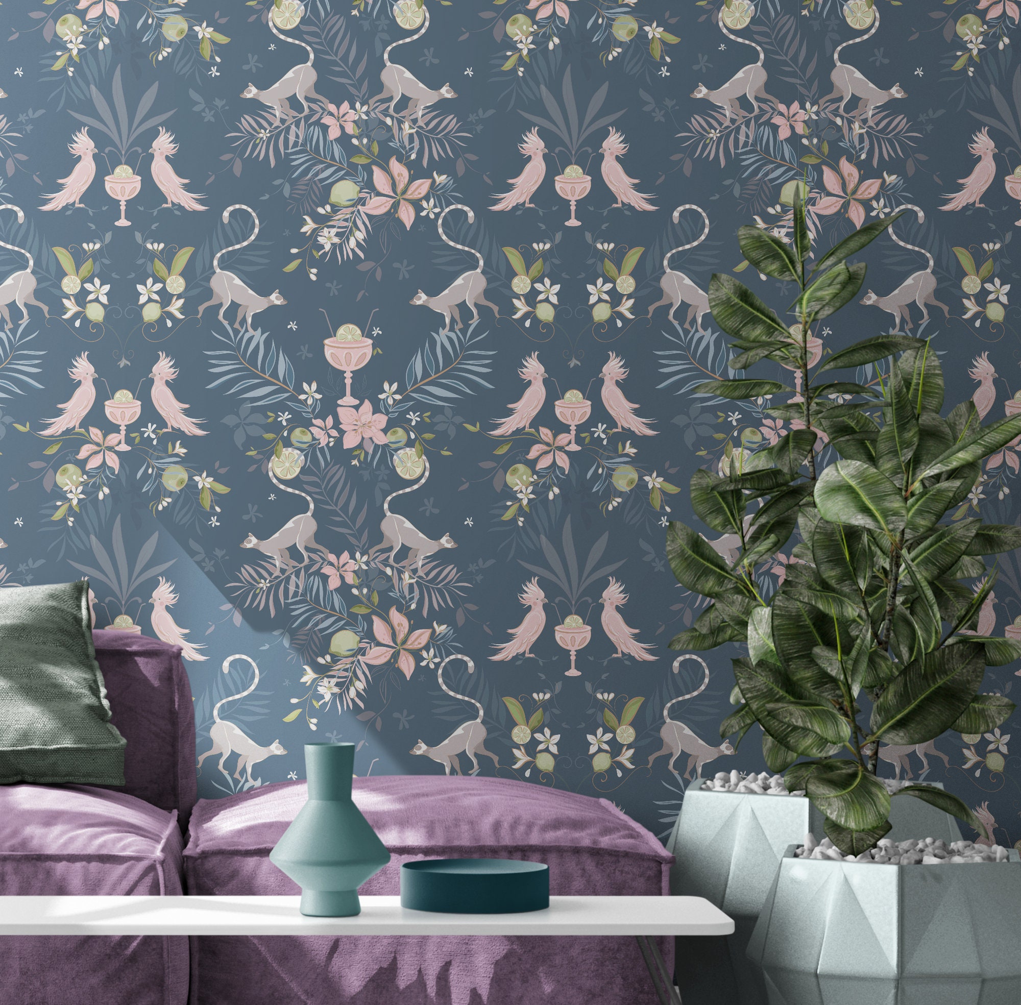 Navy Cocktail Party Wallpaper, Dusky Pink Cocktail Wallpaper, Floral Wallpaper, Monkey Wallpaper - P...