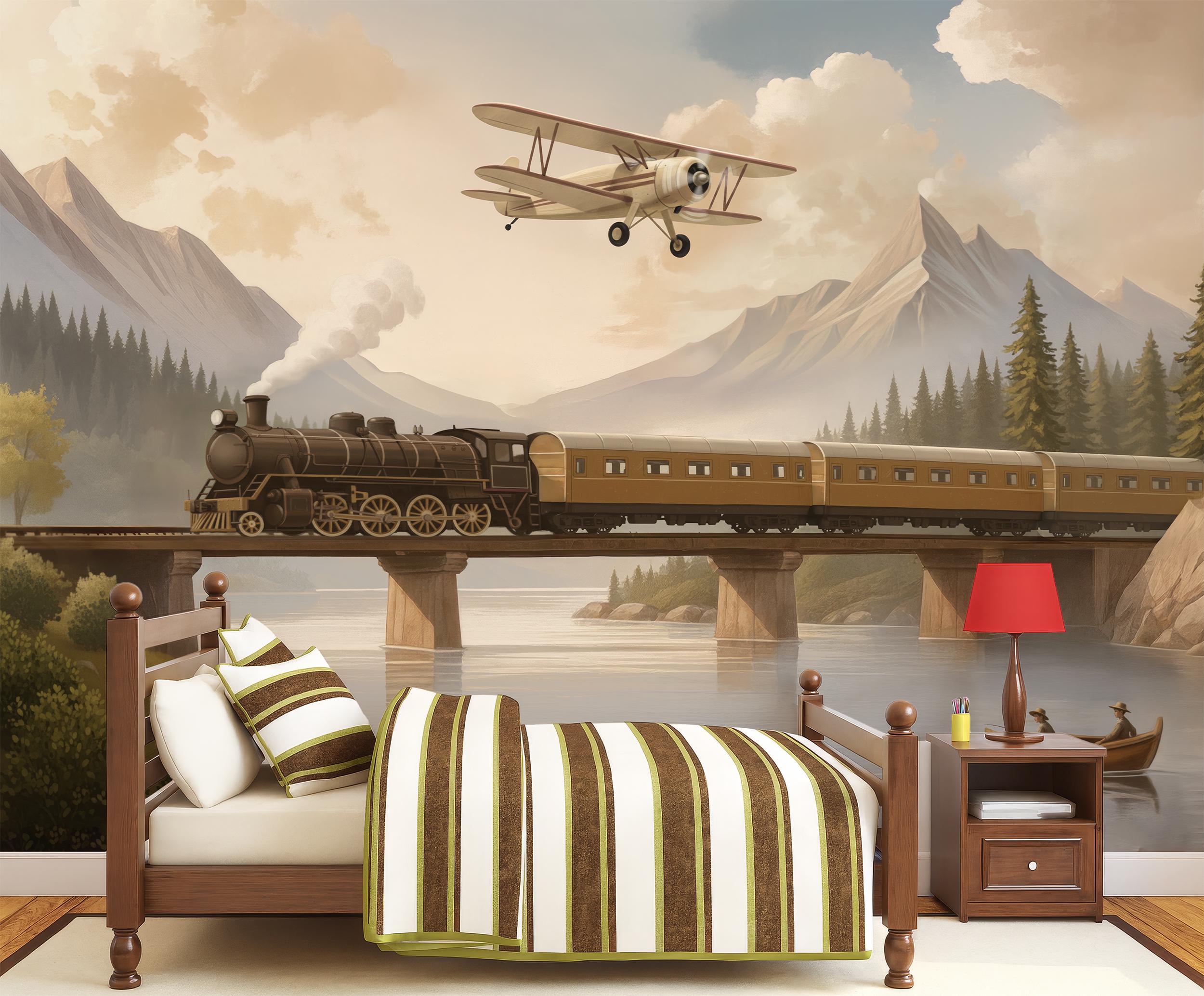 Vintage Train and Airplane Wall Mural. Featuring a classic steam locomotive crossing a bridge, a vin...