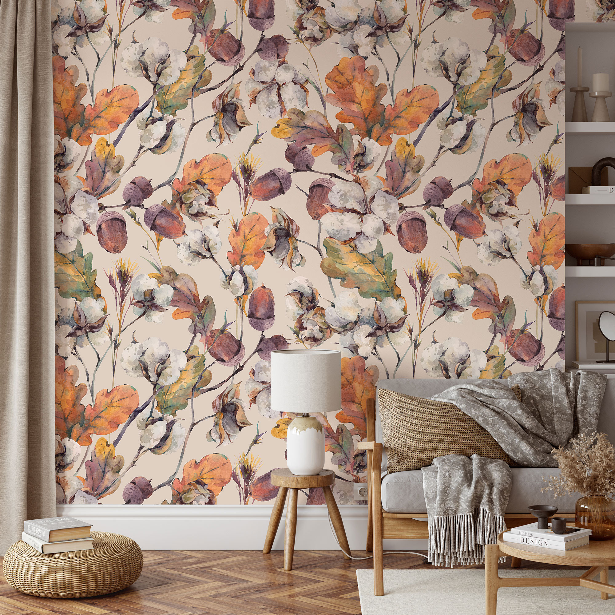 Autumn floral wallpaper, oak leaves and acorns pattern, peel and st...