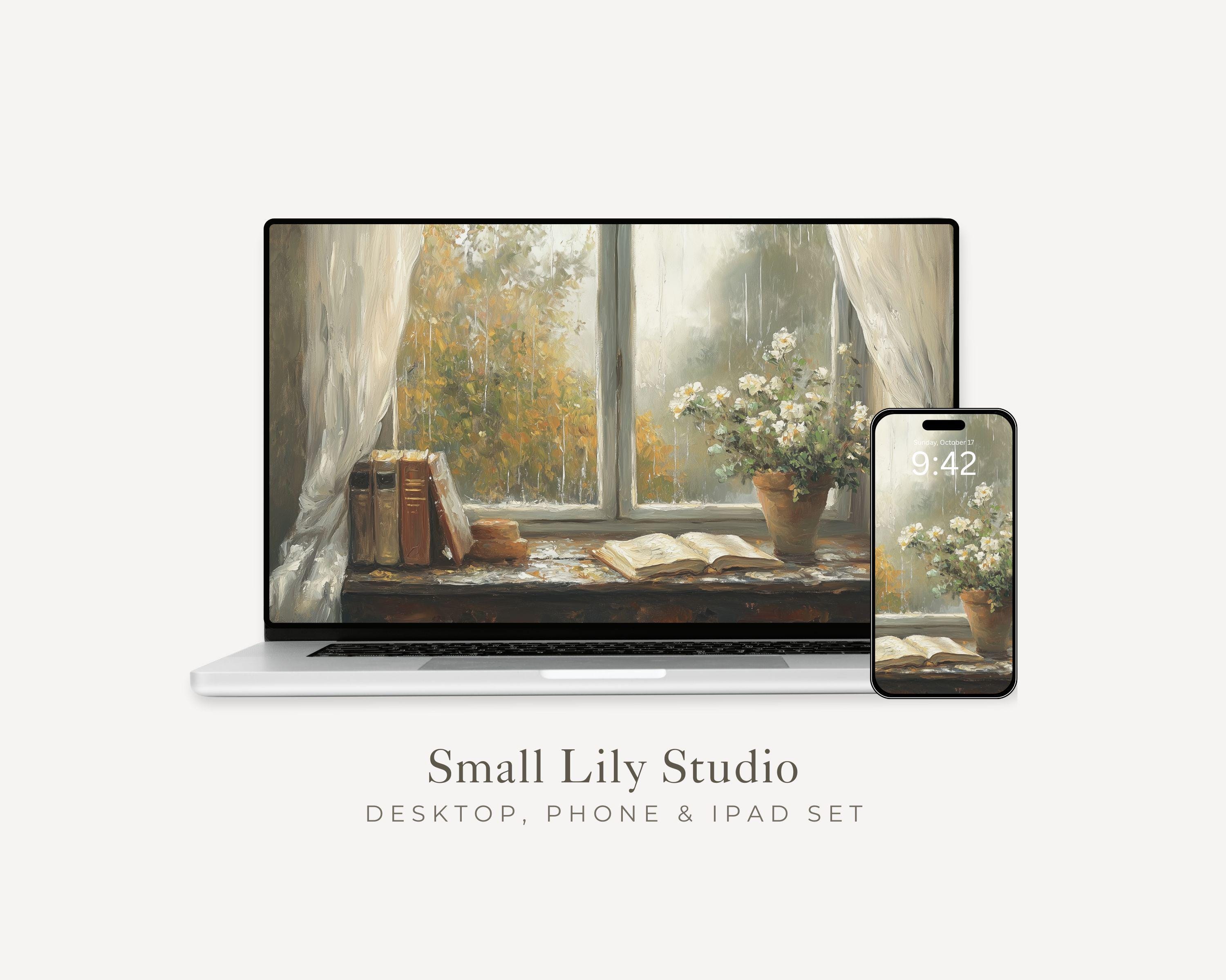 Rainy Window Desktop Wallpaper Set, Fall Leaves Phone Wallpaper, Co...