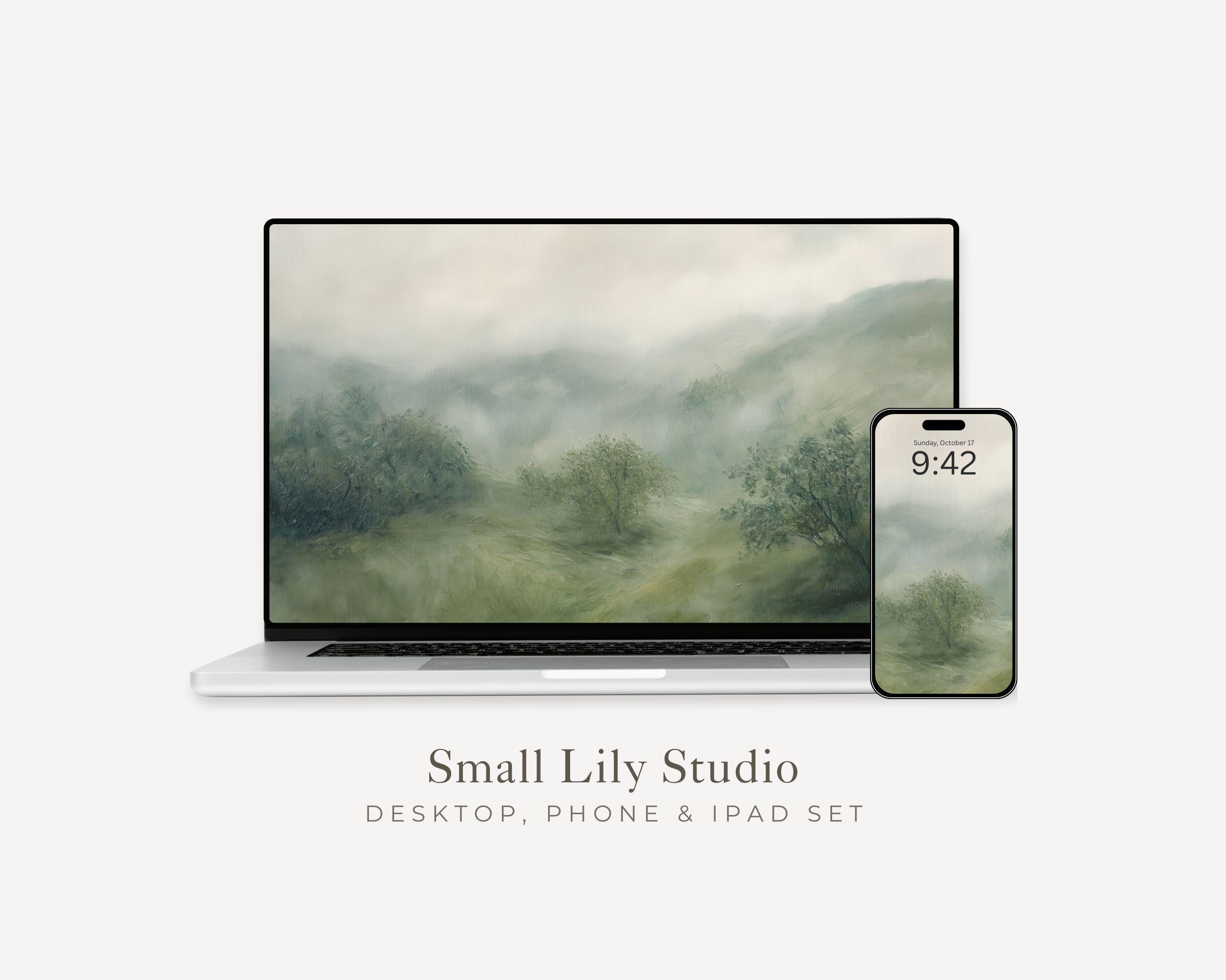 Rainy Day Desktop Wallpaper Set, Green Landscape Phone Wallpaper, R...