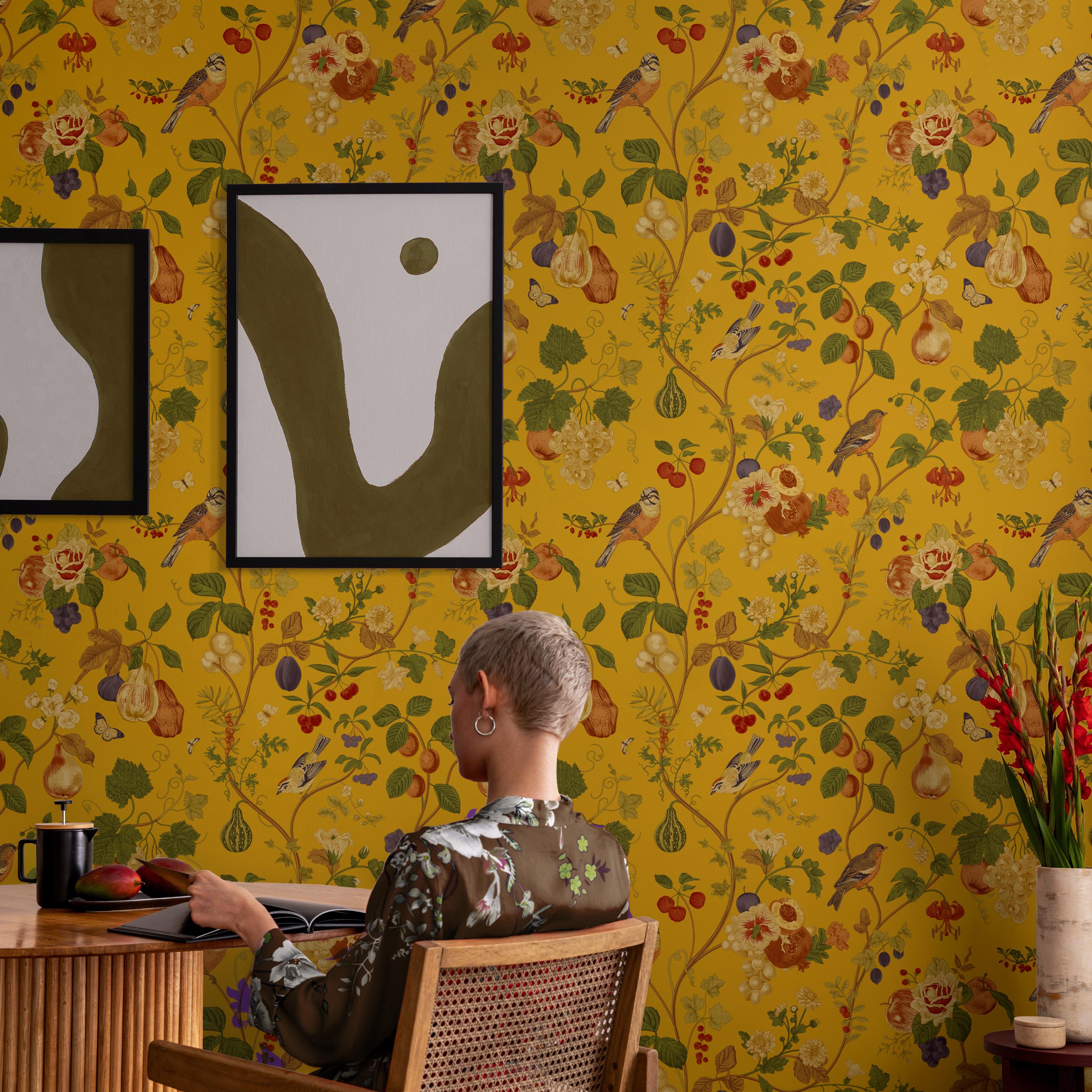Vintage Orchard Wallpaper, Fruit Bird Mural, Mustard Yellow, Type I...