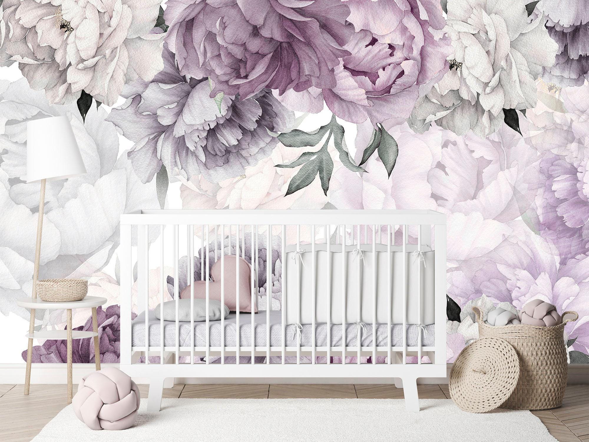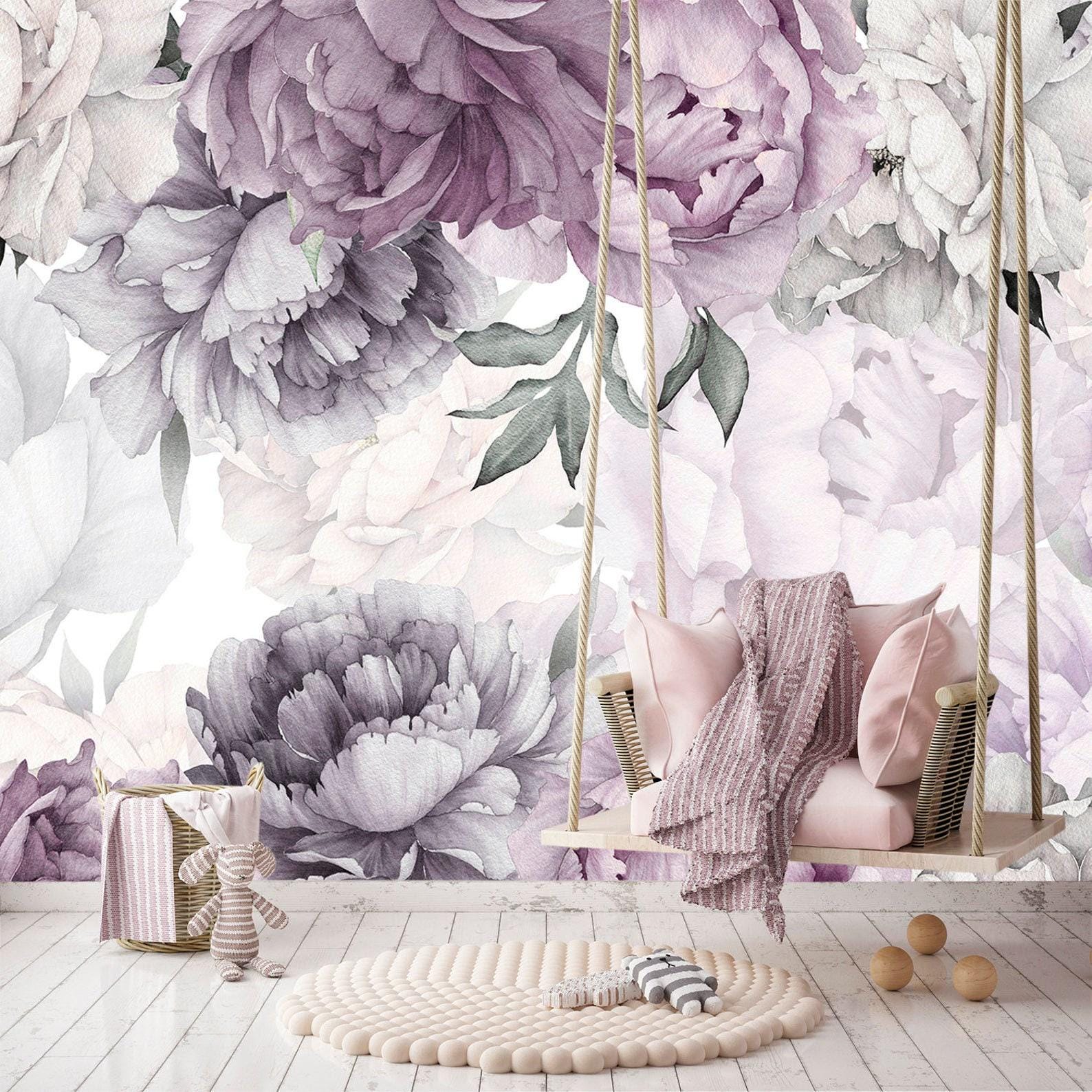 Peony Wallpaper Nursery, Watercolor Peony Flower Wall Decor Purple ...
